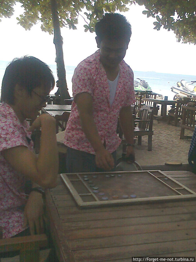Пока на пляже сыр-бор, ребятки из ивент-агентства, подготовив для кофе-брейка все, кроме кофе (жарко потому что, да и не особо тайцы кофе-то употребляют), научили моих детей новой игре. Принцип простой: камень-ножницы-бумага, — победитель передвигает по доске крышку. Цель – «съесть» все крышки противника. Артём очень преуспел, Аня не очень — строила глазки и отвлекалась…