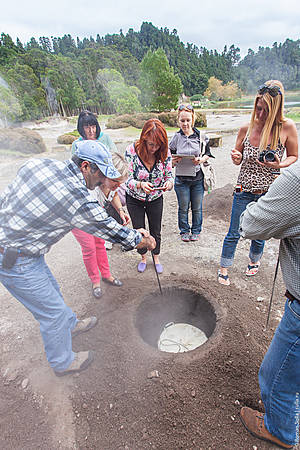 Кастрюля тяжёлая, опрокинуть её обидно, так что требуется осторожность. После того, как кастрюля была вынута её погрузили в автомобиль и отвезли в ресторан, где уже мы смогли это съесть. Скажу прямо – это очень вкусно и очень сытно. Помимо возможности приготовить еду, тут же находятся ямы с кипящей водой. Выжженая поверхность вокруг покрыта разноцветным налётом и явно демонстрирует незатухающую вулканическую активность на острове.