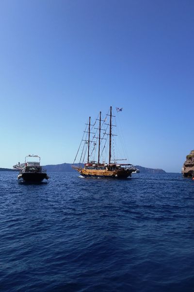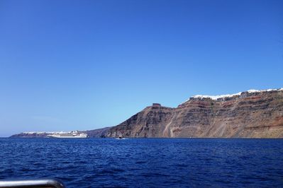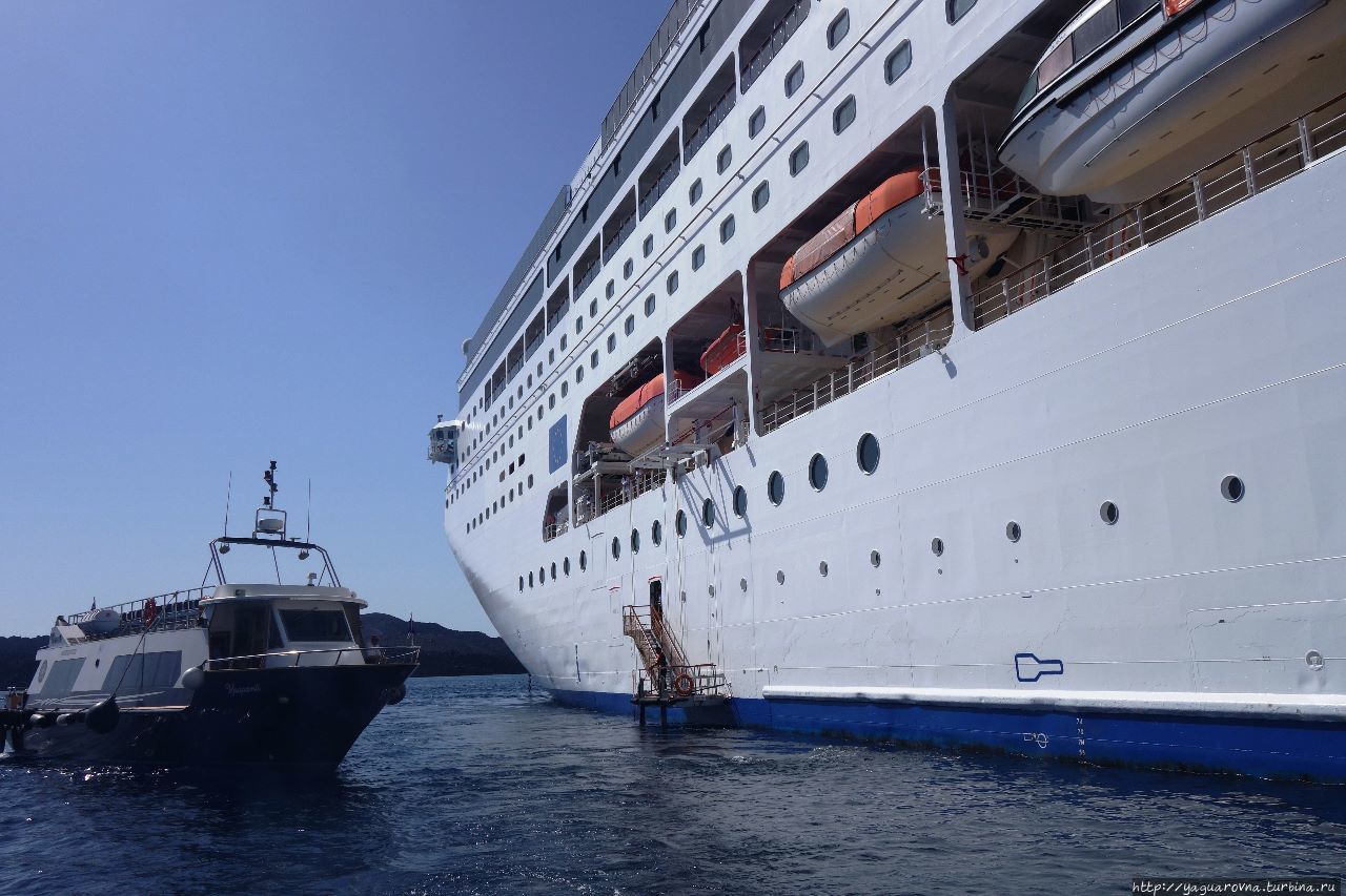 Солнечное утро ждало нас на острове Санторини. Корабль осторожно приближался к обрывистым берегам, чтобы бросить якорь и отправить пассажиров размяться на земле. Как всегда для круизников здесь предстоит тендерная высадка, к причалу могут подойти только маленькие лодочки и плоскодонные паромы.