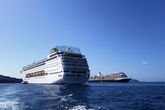 Солнечное утро ждало нас на острове Санторини. Корабль осторожно приближался к обрывистым берегам, чтобы бросить якорь и отправить пассажиров размяться на земле. Как всегда для круизников здесь предстоит тендерная высадка, к причалу могут подойти только маленькие лодочки и плоскодонные паромы.
