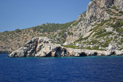 Ряд пещер подныривают под утёсы снизу.Пока паром скользит по глади моря, самое время вспомнить про историю острова. Существует много легенд про происхождение названия острова и кто был его первым обитателем. Мне нравится история про любовь морского бога Главка, про которую я уже упоминал