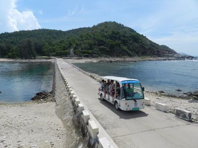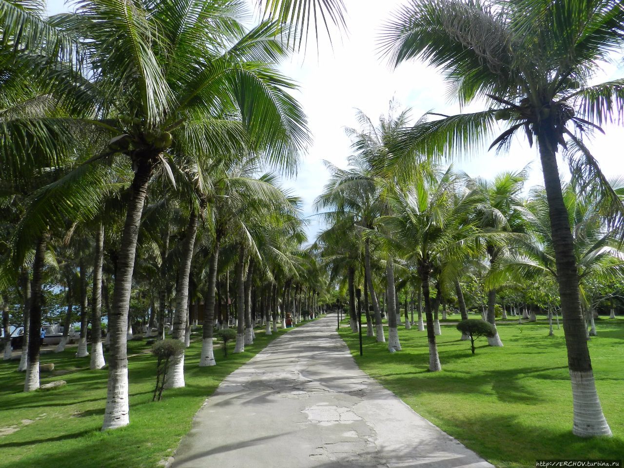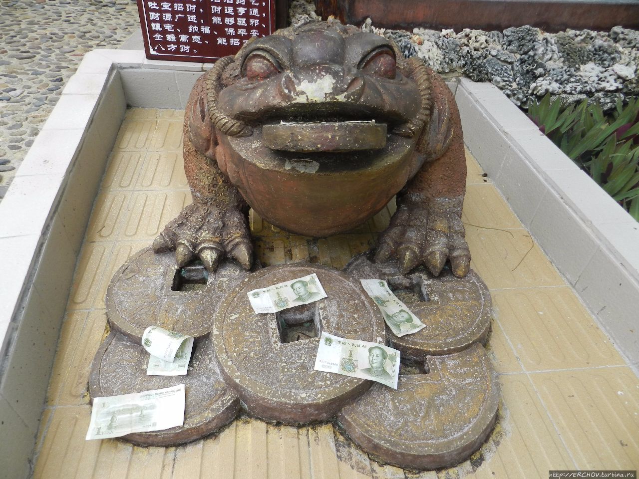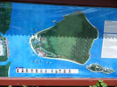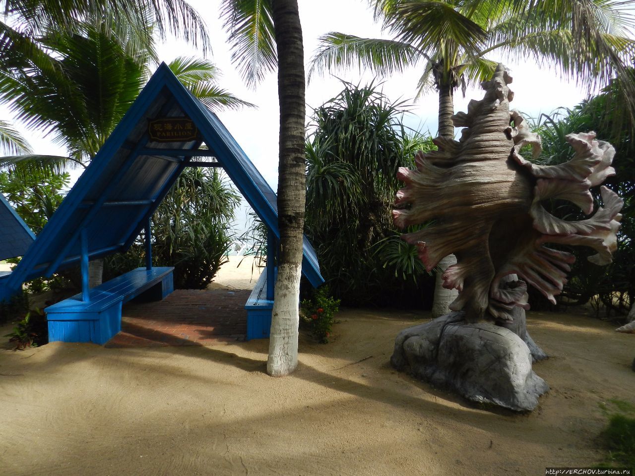 Попав на остров я первым делом принялся изучать его пешеходную зону и парковую территорию. В одном месте гигантские инсталляции воспроизводят обитателей моря. Есть здесь и рыбы, и всевозможные морские раковины. Чуть дальше я обнаружил ворота, возле которых, собирая деньги, сидела большая каменная лягушка. Внутри находился бассейн с черепахами. Крупные тортилы подплывали прямо к смотрительнице, хватая из её рук резаные кусочки арбуза. Тот, кто захочет покормить черепашек самостоятельно, должен будет выложить за корм за 20 юаней. Иду бреду по парку дальше. В одном месте обнаруживаю катер, выставленный для игр детворы на сушу. Отдыхаю в тени деревьев в одной из беседок. Прохожу мимо пирса, с которого катера и моторные лодки забирают желающих прокатиться по морю и на дайвинг. Поднимаюсь на обзорную площадку. Оная представляет собой инсталляцию больших грибов. Сверху хорошо просматривается ещё один пирс. Чуть в стороне маячит маленький островок. Направляюсь по дорожке в его сторону. Мимо меня проезжает электромобиль с туристами. Далее мы одновременно оказываемся возле ворот со шлагбаумом. Офицер проверяет билеты у своих соотечественников, у некоторых смотрит ещё и паспорта. Электромобиль он пропускает. Меня же тормозит, показывая знаками, что я должен вернуться к причалу и купить билет.