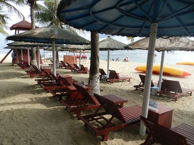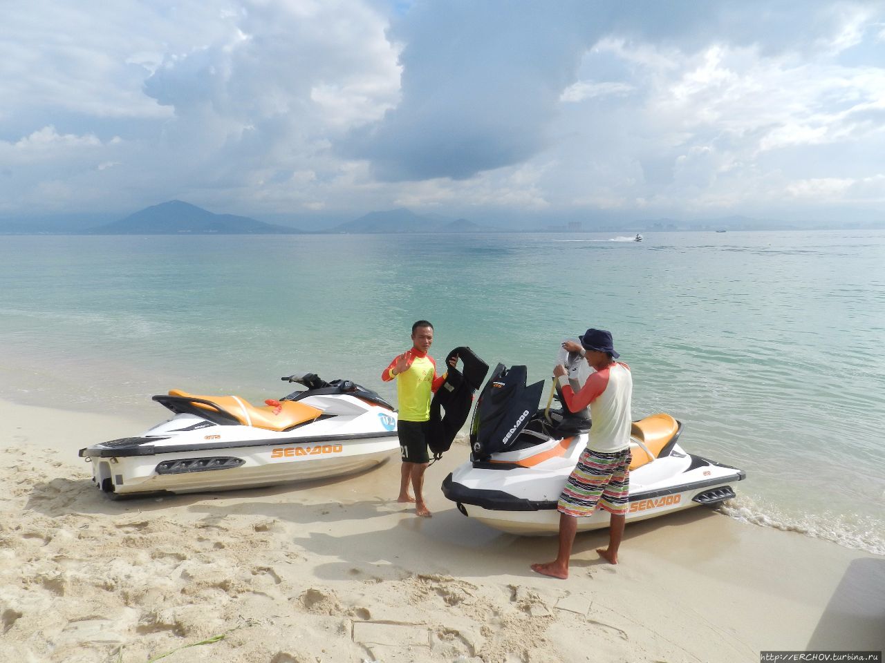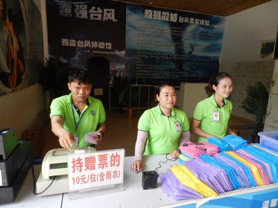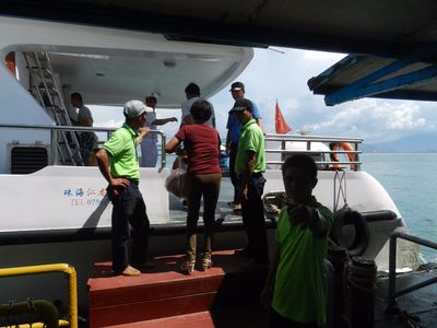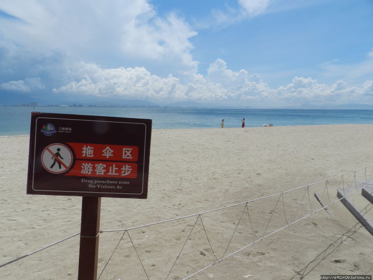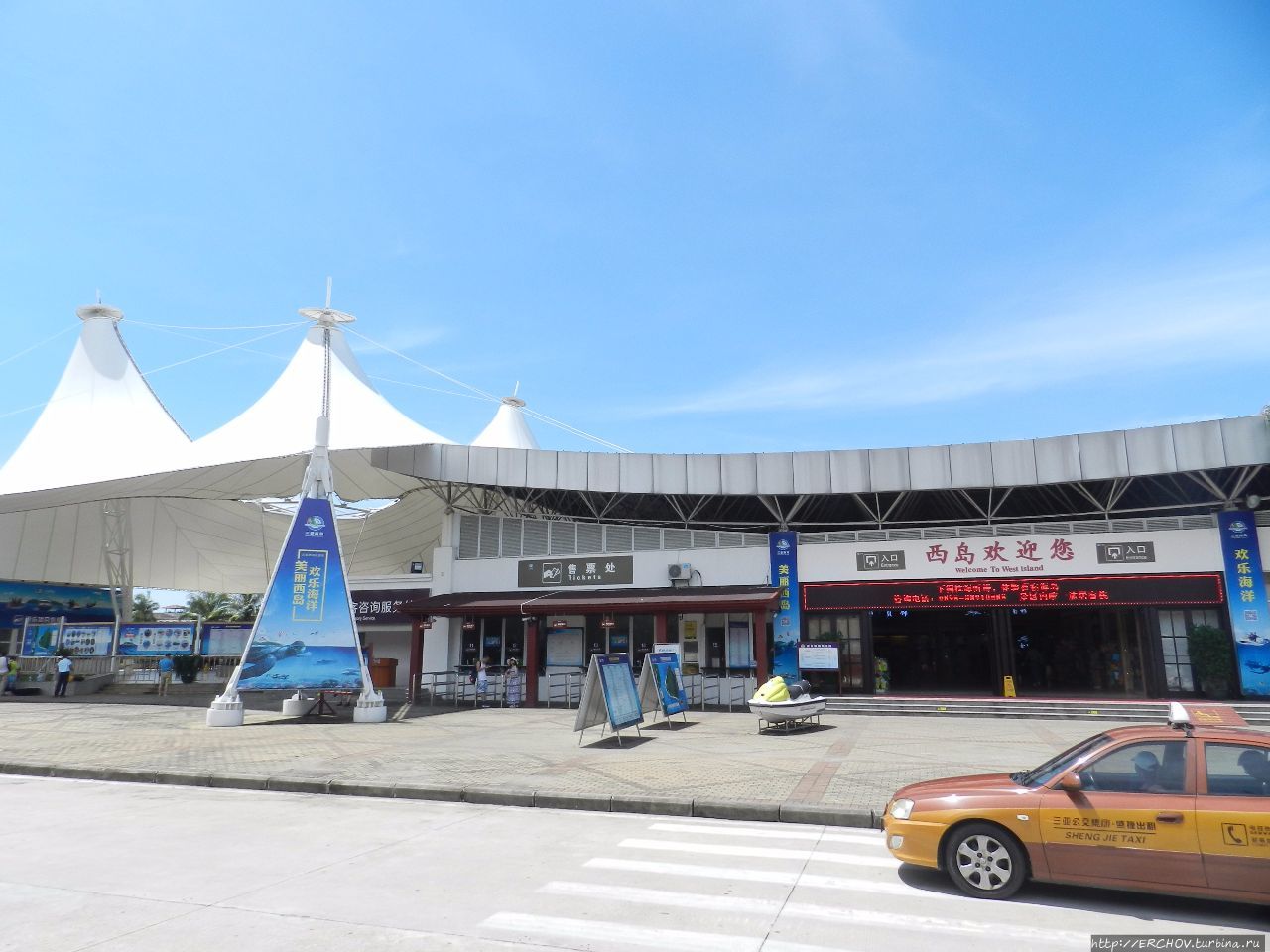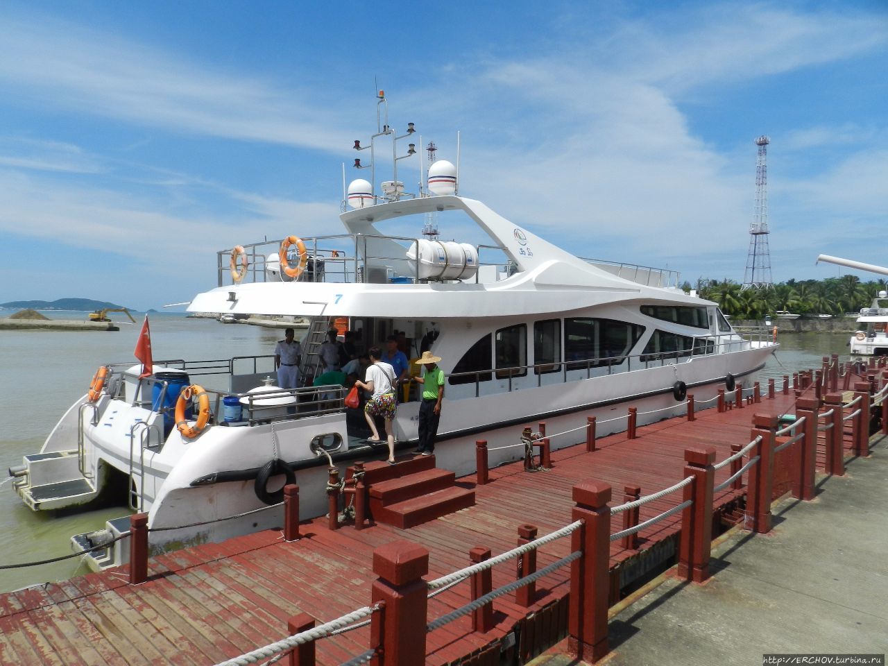 Выйдите из автобуса, перейдите дорогу. Что китайцы завтра построят, никто точно не знает. В настоящем морвокзал виден издалека благодаря шатровым куполам. В кассе предъявляете паспорт, за 140 юаней покупаете билет. Оный действует туда-обратно. По билету заходите на причал. Отстояв небольшую очередь, вместе со всеми загружаетесь на катер. Расписания для катеров не существует. Они ходят туда-обратно по мере наполняемости. При этом сам морвокзал расположен в устье реки Chonghuihe. Итак, загрузились, отходим от пристани. На море может быть волна. В этом случае пассажирам, как и в самолёте, рекомендуется пристёгиваться. В хорошую погоду пролив можно перейти минут за двадцать. Выходим на пирс. Паром же просто так не стоит. Загрузив других пассажиров, капитан сразу направляется на Хайнань. Учжичжоу хоть и находится рядом, попав сюда сразу чувствуешь, что это другой мир. Никакие реки в море здесь не впадают, и потому море чистое. Более того, вблизи Учжичжоу любители нырялки занимаются дайвингом. Насколько я видел, просто на полотенцах никто не лежит. На пляже необходимо арендовать лежак. Не хотите купаться, можно спрятаться от жары в кафе. Одним словом, богатые китайцы едут сюда отдыхать, или точнее — тратить деньги.