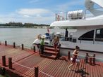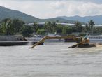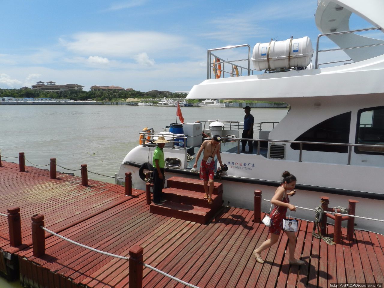 Устье реки Chonghuihe, где расположен порт, находилось от моего отеля относительно не далеко, и потому ближе к вечеру я захотел туда прогуляться. Во второй половине дня туристы с Учжичжоу возвращаются. Перед входом в устье реки капитан снижает скорость и делает три длинных гудка. Для чего? Сперва я этого не понял, но всё оказалось просто. Река несёт в себе великое множество песка. Чтобы она оставалась судоходной, в одном месте работает экскаватор, который безостановочно (во всяком случае в дневное время) черпает из реки песок. Услышав гудок, экскаваторщик убирает ковш. Получается, изначально под большие катера фарватер реки был не приспособлен. Порт здесь, как и устремлённый в будущее город Санья, как и благоустроенный Учжичжоу, как и другие новостройки — всё это появляется благодаря старанию и трудолюбию китайцев, ведомых, о чём мы забыли, Коммунистической Партией Китая!