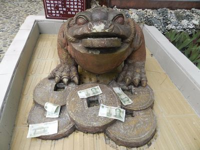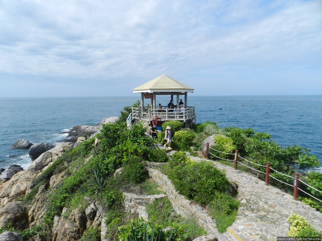Сам островок составлен из великого множества камней: больших и огромных, средних и мелких. Господь разложил их так, что получились два холма, которые люди соединили подвесным мостиком. В настоящем островок представляет собой пешеходную зону, оборудованную дорожками. Поднимаюсь в беседку на малую вершину. Общаюсь с детьми, осматриваю окрестности со смотровой площадки и иду дальше. Впереди подвесной мост. Идти по нему лучше всего в одиночестве, ибо попутчики своими шагами мост раскачивают. Китайцы привязывают к его серым тросам красные ленточки. В любом случае, виды с моста просто обалденные. Хорошо, что я приехал на одном из первых катеров. Чуть позже туристов здесь будет (и бывает) в несколько раз больше. Со своего балкона в отеле я видел, что на маленьком островке блестит что-то золотистое, но что это такое, из за дальности расстояния рассмотреть я не мог. Вторая вершина украшена монументом быка. Животное скульптор изобразил в движении. Кажется что позолоченный бык вот-вот проткнёт кого-то своими рогами. Любуюсь сверху на мостик, соединивший два острова, и далее по дорожкам спускаюсь вниз. Тут как раз подходит электромобиль. Компанию мне составляет всего один китаец. Водитель более никого не ждёт, и мы едем назад. С правой стороны появляется какой-то памятник. Увы, я не успеваю его рассмотреть. Вернувшись в пляжную зону, замечаю, что отдыхающего люда на острове прибавилось. Те качели в кафе, что были ещё час назад пустыми, теперь заполнены. Началось шевеление в рыбном ресторане. Оный работает по принципу: заплатил — ешь сколько хочешь. А вот в магазины народ не спешит. Сувениры на Хайнане довольно однообразны.Сами китайцы, что и где дешевле, знают, и потому интереса к здешним магазинам не проявляют.
