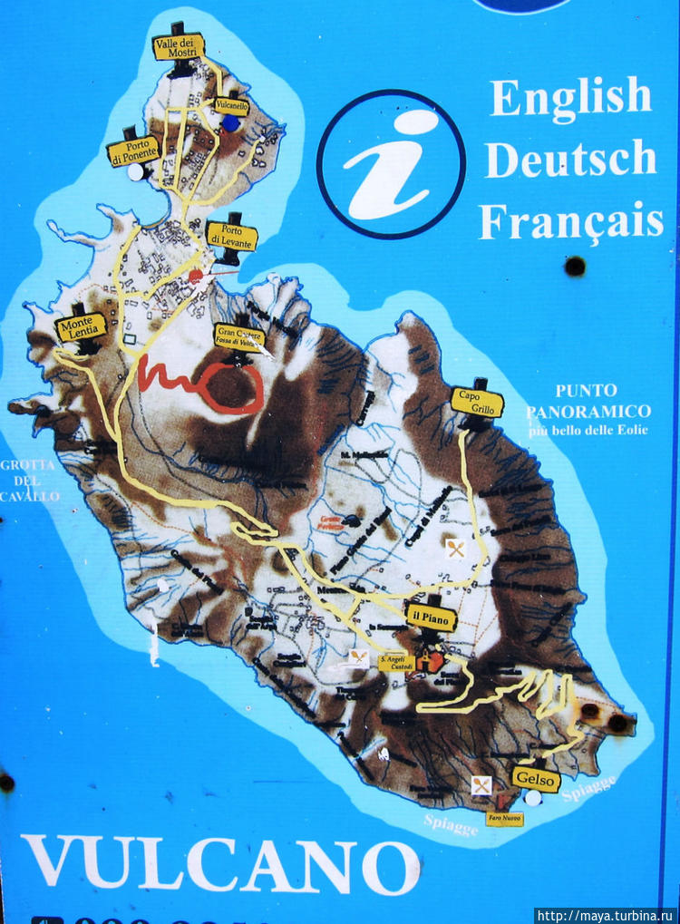 Состоит остров из 2-х вулканов с узеньким перешейком. Вот в этом узком месте как раз и находится порт. Мы прибыли в порте ди Леванте. В порту висит большая карта, на которой обозначены все улицы, дороги и тропы. С чего начать? Глаза разбегаются! Есть большой кратер и Вулканело (маленький кратер) , знаменитые фанги — сероводородные грязи (там, кажется, нашли 18 минералов, которых нет больше нигде), .да еще фумаролы – горячие источники газов на склонах и в кратерах вулканов. А я еще фумарол не видела. Успела я много, но не все. Во-первых, я впервые за границей пошла на пляж. Обычно, времени на пляж мне жалко. На пляже я сижу ту часть лета, когда я уже в отпуске, а муж еще нет. Но тут! Пришли мы сначала к фанге. Запах такой, что даже близко не подойти. Правда, людей там много, и запах им вроде бы не мешает, привыкли, наверное. Идем на пляж рядом с грязевым .Мимо скульптуры из лавы. По неопытности я решила, что это и есть пляж с черным песком. Потом выяснилось, что это не так. Но пока мы искупались в Тирренском море. И тут-то я и увидела фумаролы. Достаточно нырнуть, чтобы увидеть нити из пузырьков газа, выделяющихся из каждой щели. Забавно было ловить пузырьки руками. А уж когда оказалось, что этот песок – не черный, а знаменитый пляж Байя Негра всего в 800 метрах, мы, конечно же, побежали туда. На черном пляже песок мелкий и мягкий, только черный, как уголь. Зато вода здесь не булькает. На горизонте остров Липари. Чуть дальше Долина Монстров. Но ее лучше смотреть с моря. Мы уже видели ее, когда подплывали. Кроме того, скоро будет три часа дня, а после этого поесть будет затруднительно, так что мы решили пробежаться по городу, а заодно где-нибудь пообедать. Город очень уютный, кроме жителей, занятых туристами, тут живут ученые-вулканологи. Школы на острове нет. Ученики едут на Липари на катере. Всего-то 20 минут.