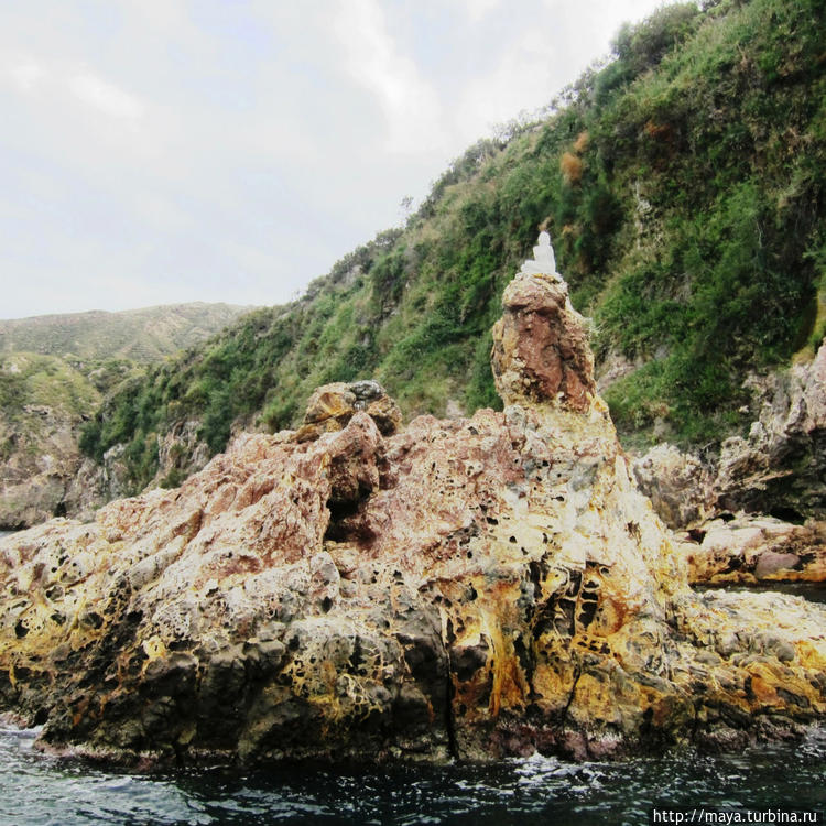 Наш катер провез нас мимо "залива Венеры" и "Лошадиного грота". Вообще изрезанное побережье этого острова дарит незабываемые виды. Морская прогулка доставила несказанное удовольствие, несмотря на то, что погода начала портиться. Среди скал мы обнаружили скульптуру прекрасной девушки. Гид так и не смог объяснить, что это за девушка на вершине скалы. То ли возлюбленная скульптора, то ли сама Венера. Зато не забыл упомянуть, что где-то тут в далеком 1949-м году снимался фильм «Вулькано» с Анной Маньяни. Надо будет посмотреть.