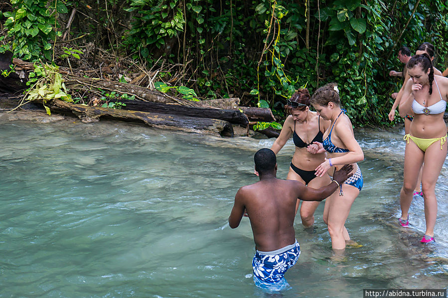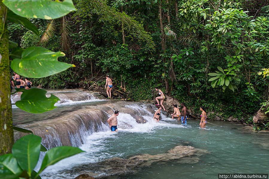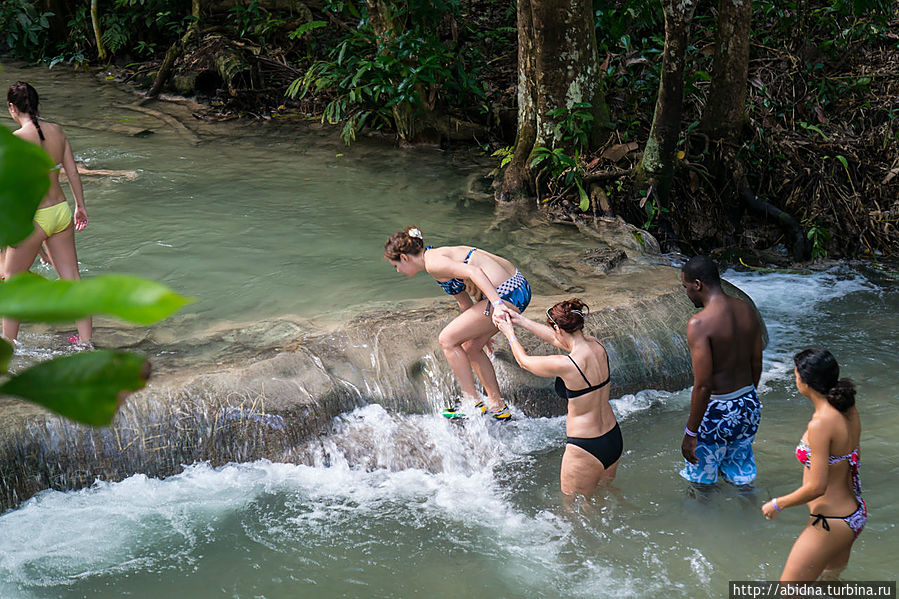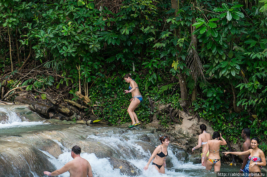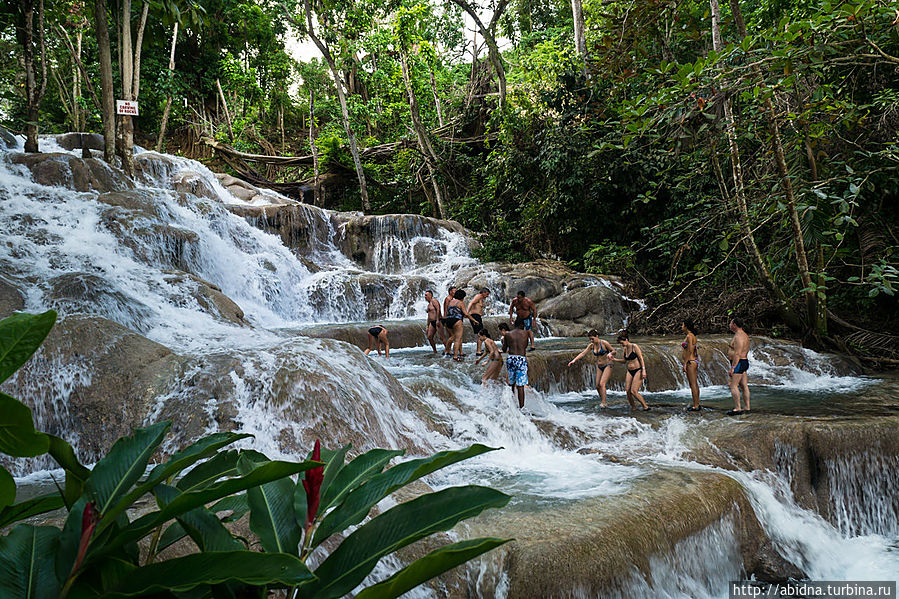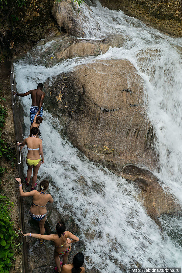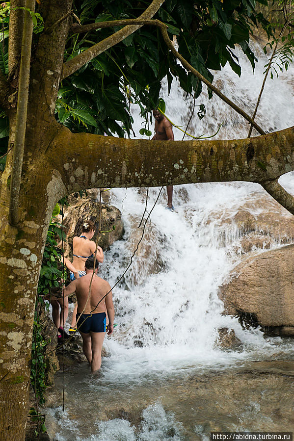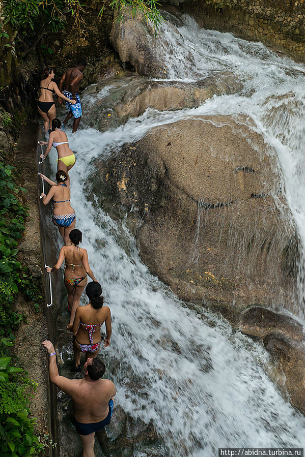Водопады Dunn`s River — одна из самых красивых достопримечательностей Ямайки, находится на северном побережье острова, неподалеку от курорта Очо Риос. Водопад состоит из нескольких каскадов, между которыми образуются небольшие лагуны. Высота водопада — около 180 м. Для туристов здесь создано такое развлечение — подъем по водопаду напротив течения, то есть снизу вверх. Можно делать это и самостоятельно, но рекомендуется, конечно же, в составе группы и под руководством гида. Все-таки один неправильный шаг – и может возникнуть опасность для жизни. Обязательно стоит приобрести специальные тапочки, или взять их на месте в аренду. Странно, но шлемы здесь никому не выдаются, да и спасателей я нигде не видела. Возможно, страшно было при подъеме только мне? Как сказал в конце всего нашего тура наш сопровождающий, самым большим впечатлением от поездки стал подъем по водопаду и полные ужаса глаза Анны, то есть мои. Слава богу, все закончилось хорошо, 40 минут подъема пролетели как одно мгновение, и вот уже мы на вершине — радуемся нашей победе! Мы сделали это!