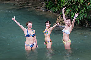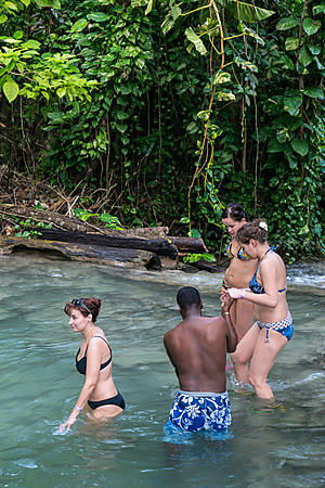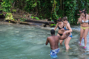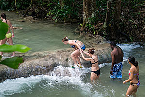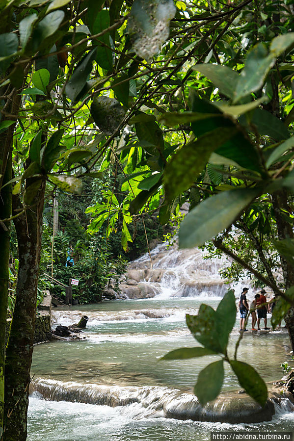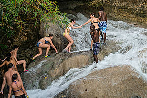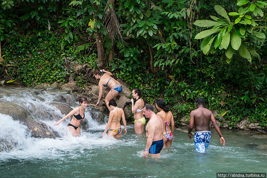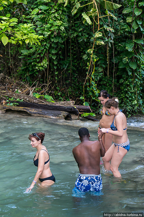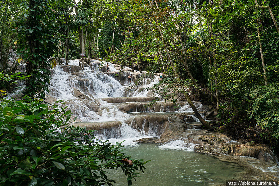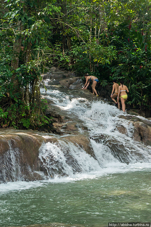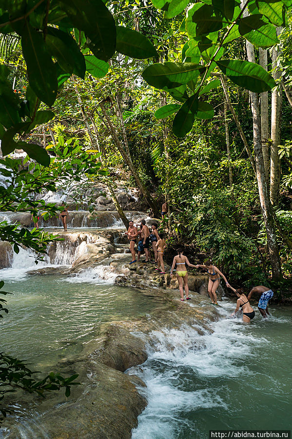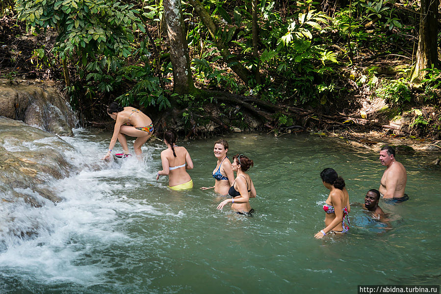 Водопады Dunn`s River — одна из самых красивых достопримечательностей Ямайки, находится на северном побережье острова, неподалеку от курорта Очо Риос. Водопад состоит из нескольких каскадов, между которыми образуются небольшие лагуны. Высота водопада — около 180 м. Для туристов здесь создано такое развлечение — подъем по водопаду напротив течения, то есть снизу вверх. Можно делать это и самостоятельно, но рекомендуется, конечно же, в составе группы и под руководством гида. Все-таки один неправильный шаг – и может возникнуть опасность для жизни. Обязательно стоит приобрести специальные тапочки, или взять их на месте в аренду. Странно, но шлемы здесь никому не выдаются, да и спасателей я нигде не видела. Возможно, страшно было при подъеме только мне? Как сказал в конце всего нашего тура наш сопровождающий, самым большим впечатлением от поездки стал подъем по водопаду и полные ужаса глаза Анны, то есть мои. Слава богу, все закончилось хорошо, 40 минут подъема пролетели как одно мгновение, и вот уже мы на вершине — радуемся нашей победе! Мы сделали это!