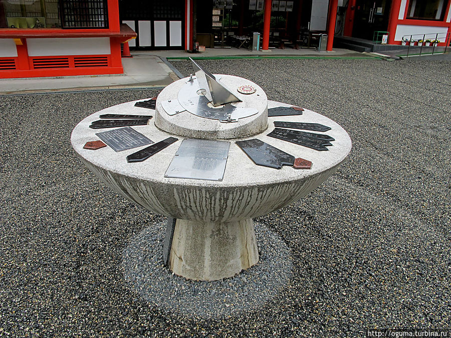 Кто из вас слышал о городе Оцу (Otsu, 大津市)? Возьму на себя смелость сказать что почти никто. А между тем этот относительно небольшой городок с населением около 340 тыс., который то и получил статус города всего лишь в 1898г, на короткое время был столицей Японии. Всего лишь с 667 по 672–ой год. Недолго, но был! Он почти незаметен в тени своего более именитого соседа Киото, и в гуле хора туристических голосов его имя почти не слышно. А тем не менее, в городе и его окрестностях расположены известные исторические памятники, в том числе и объект наследия Юнеско (Enryaku-ji). Но речь сегодня пойдёт о более скромном синтоистском храме Оми-Дзингу. Храм по меркам нашего времени молодой – основан в 1940 году, для обожествления 38-го императора Тэндзи (626-671 гг.), кто собственно и перенёс сюда столицу. Храм красивый, интересный, с прилегающим парком и красивой сакурой, как и полагается большому синтоистскому святилищу. Но есть в нём изюминка – прямо на главной площадке святилища установлены точнейшие солнечные часы. Немного позади их расположилась модель первых в Японии водяных часов, создание которых приписывают императору Тэндзи, когда тот был ещё принцем. Именно поэтому город Отцу иногда называют местом рождения временного исчисления в Японии. Чуть поодаль от водяных часов находятся старые огненные часы и рядом музей старых часов со всего мира. Помимо разных часов, в храме растёт красивейшая сакура с большими лепестками, а на прилегающей территории также немало сакуры других сортов.