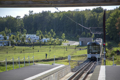 Поездка на Тран панорамик или панорамном поезде – это очень хорошее мероприятие, к которому я подбирался несколько лет, но все не было возможности попасть туда. В этот раз удалось, чему я несказанно рад. Все предельно просто и понятно – смотрите на сайте расписание поездов на этот день, едете по специальным указателям в сторону Пюи-де-Дом, там паркуетесь на большой бесплатной парковке, покупаете билеты либо в кассе, либо в автомате – как хотите, и можете спокойно ждать своего поезда в кафе или в магазине с сувенирами. Через какое-то время подъезжает очень комфортный поезд, который везет вас прямо на вершину Пюи-де-Дом к этой радио-телевизионной антенне (которую ты столько раз видел из окна автомобиля), по дороге демонстрируя овернский пейзаж из заснувших вулканов.