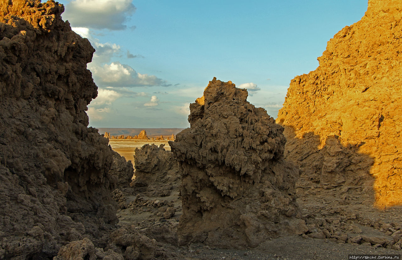 Очень интересно происхождение этих столбов-"дымоходов". Как раз на джибутийской части озера было множество теплых сероводородных источников (потому здесь вода озера не приятно пахла, и название Лас Аббе означает что-то типа "тухлая, или плохая вода"). Но, что не нравится людям, очень по душе различным микроорганизмам. Они с удовольствием концентрировались возле этих источников, активно размножались, активно умирали... Эти микроорганизмы, "спрессованные" вместе с донным грунтом, и образовывали эти, достигающие более 10 метров в высоту, наросты над источниками. Эти наросты обладали довольно высокой плотностью и устойчивостью к разрушению.