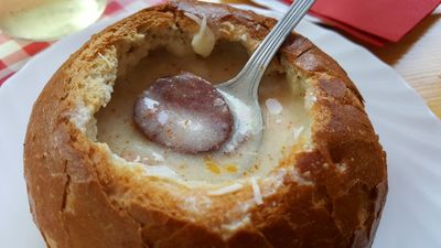 Teri mama vendéglője - вкусное место венгерской кухни. Пока ещё сносно пахал польский мобильный интернет, я отстучала депешу на родину Лене Lesik1 с вопросом куда податься и чего отведать. Она то меня сюда и отправила, за что ей громадное спасибо. По-честному предупредила, что место шибко популярно, так что лучше сделать бронь столика заранее. Но какое там заранее, если мы опомнились, буквально уже стоя на симпатичной террасе в дверях заведения. Навстречу вышли симпатичные мужчины в фартуках, осведомились о цели визита и, состроив сочувственные мины, отказали нам по причине полной брони. Но мы же люди из Восточной Европы, и не было случая ещё, чтоб при таком раскладе, не нашли бы мы консенсуса. Столы по факту свободные есть, стало быть за них можно сесть. Логично? Да! — А когда, — говорю,- ожидаете гостей?