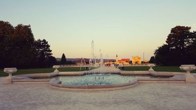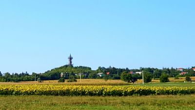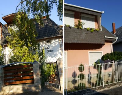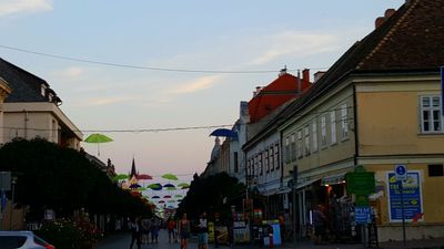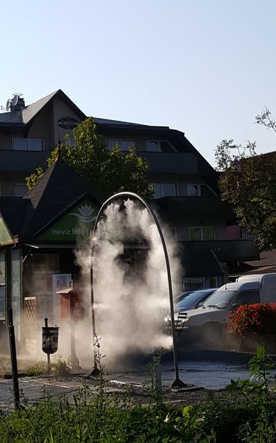 К примеру, наши соотечественники приезжают сюда семьями на несколько недель. Собственно не наши поступают аналогично. Селятся в отелях или арендуют домики, именуемые тут независимо от размеров непременно виллами. Днём по жаркой погоде окна таких вилл наглухо закрыты, что создаёт ощущение отсутствия в них жизни, но это далеко не так. Спрос рождает предложение, поэтому там повсеместно идёт строительство новых вилл. Где надо, если что, подрисутют,а где надо — подналепят. Но это так, заметки "из окна". Как и вот это здание, почему-то кажущееся мне очень знакомым. А вот что это и для чего, никак не вспомню. В августе в Венгрии жарко и не просто, а очень! В таких случаях, как и положено в приличных европах, тут вам тоже предлагается питьевая вода дабы восполнить водно-солевой баланс. Местами. И чаще где-то противноватая на вкус. Зато, как вот в Хевизе, ставят кое-где водяные арки чтобы усталый путник или разморённый отдыхающий мог освежиться. Просто таки бюджетный спа в действии. А вокруг гераньки растут в кадушках да горшках. Да слива манит из палисадников синенькими бочками. Вот, значит, как она выглядит — та самая "венгерка". Удержались — не сорвали. Вообще, в том же Хевизе есть на что посмотреть, да мы и посмотрели, но как-то заметались без плана то, да и интернет приказал долго жить, так что фотосет города оставлю до следующего раза. "Война войной", а обед, извольте, по расписанию. И был он тут —