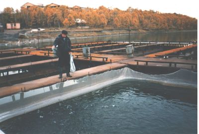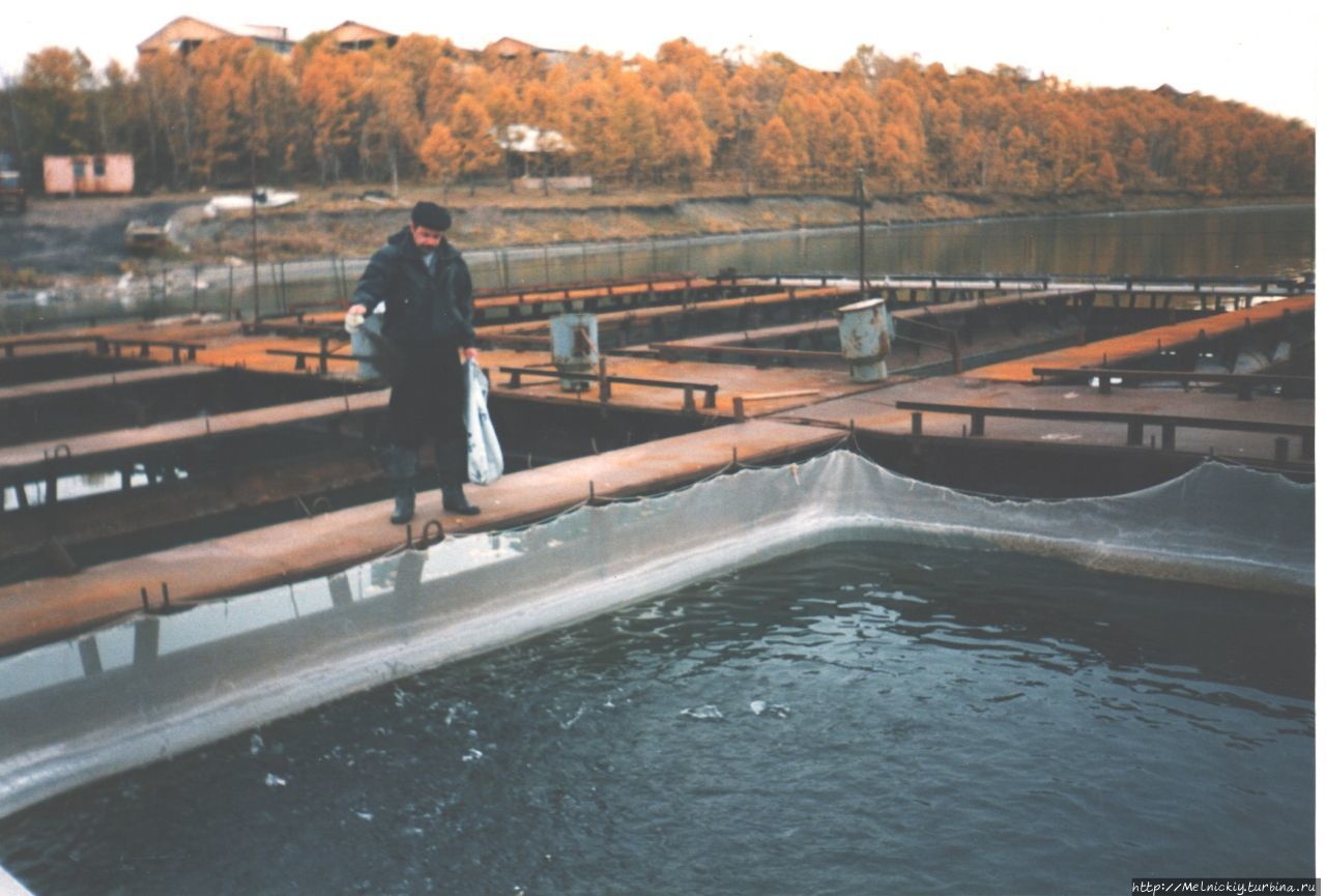 В один из приездов застал выемку рыбы из садков. Вот такую кету и форель выращивают в озере.