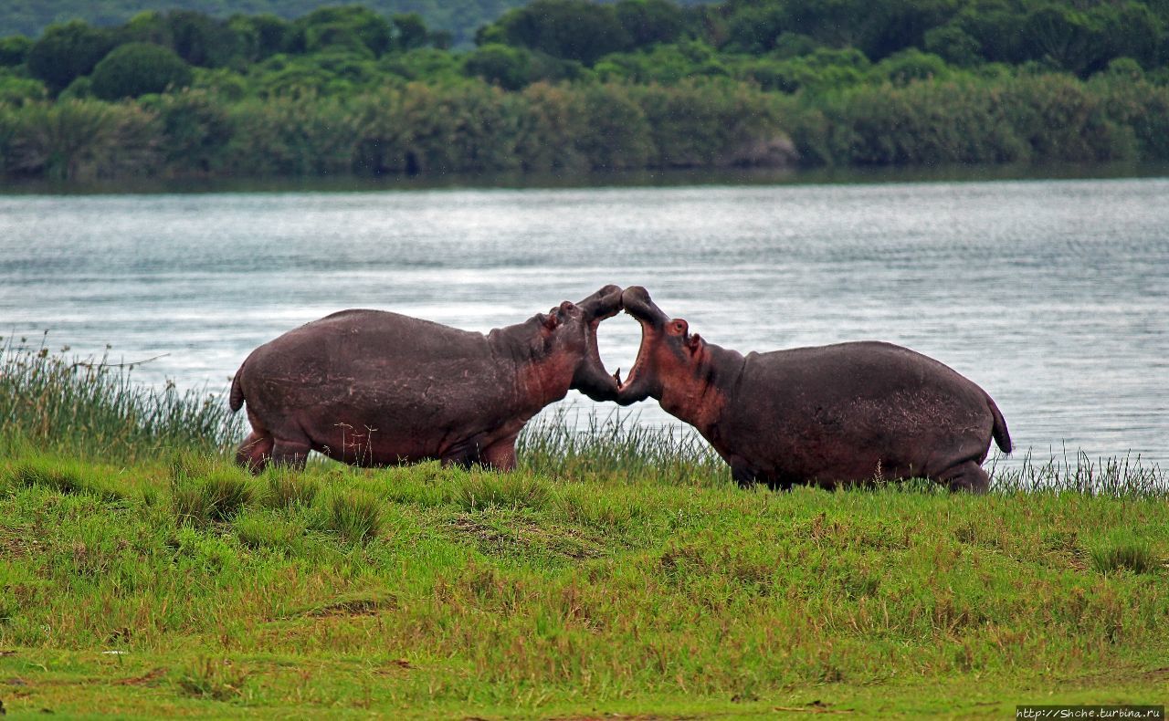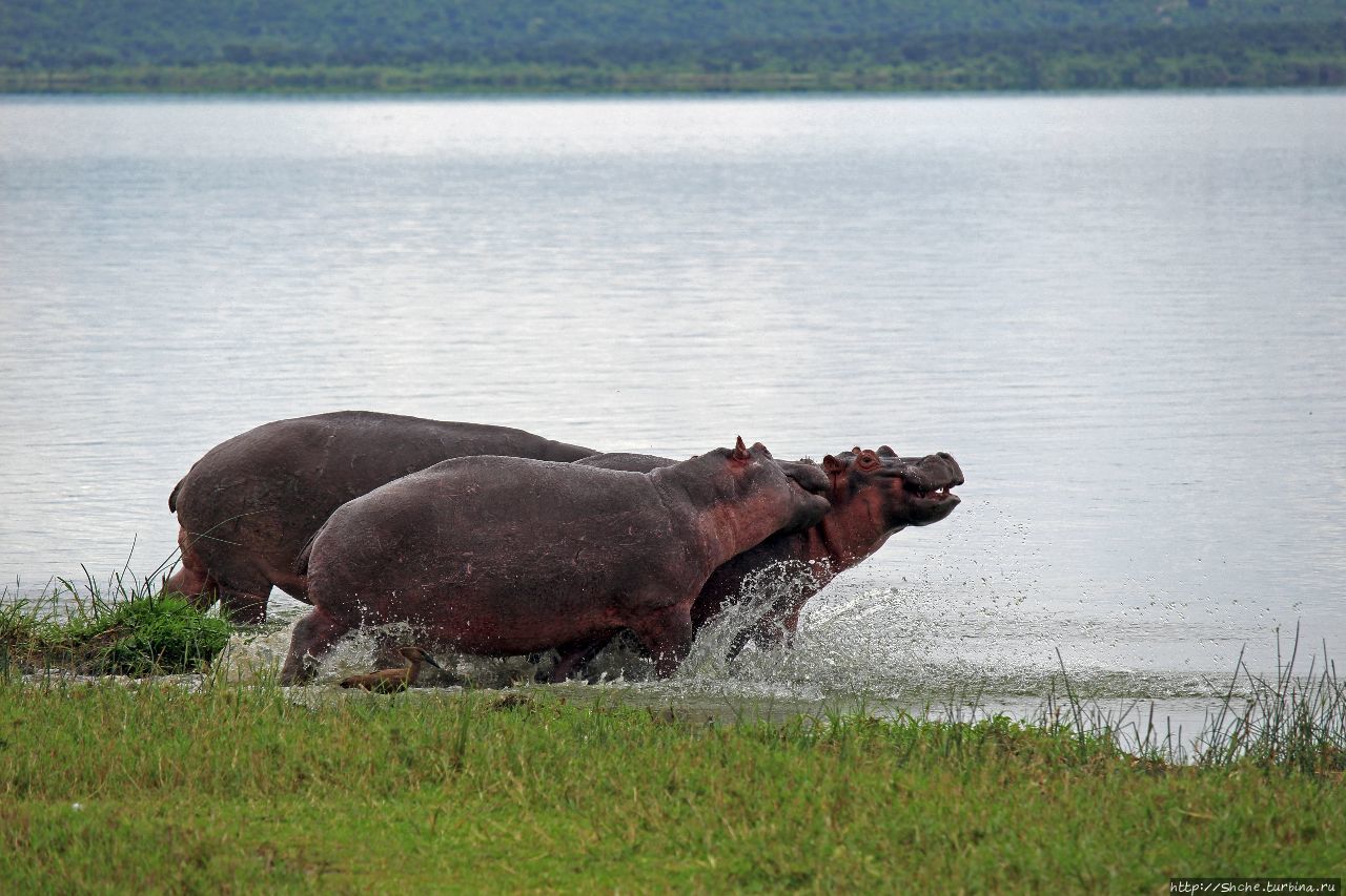 А начиналось просто. Мы ехали вдоль берега озера от городка Катве, где смотрели (у нас в группе оказались люди, кто еще не видел), как местные добывают соль из озера. На берегу из первой машины заметили, как пара бегемотов играет в свои непонятные игры...