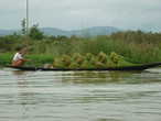 Наш капитан постоянно притормаживал, давая возможность своим землякам продать нам рыбу, только что выловленную. Но никто ничего покупать не собирался, фотографируя хором продавцов и их рыбу, а заодно и всё вокруг. Пейзажи впечатляющие и волнующие, даль в голубой дымке, лодочники, стоя на самом краешке, неспешно гребли одной ногой, удивляя и одновременно восхищая необычным способом держать весло. При этом их руки привычно были заняты работой. И не только рыбу здесь ловят, а ещё и траву со дна достают и в лодку складывают. Берега озера изрезаны каналами, работает техника, прокапывая новые, что бы площадь озера увеличить.