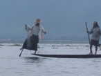 Здесь же он, стоя на одной ноге и обвив весло второй, именно обвив, гребёт по озеру, расставляя сети. На этой же площадке он отдыхает, удобно усевшись и скрестив ноги.