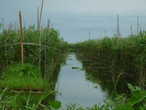 Выращивали здесь помидоры, тыкву, огурцы. Каждая семья имела свои полосы, за которыми ухаживала и собирала урожай прямо с лодки, приплыв сюда вроде как на дачу. Да и дачные домики стояли на сваях, где хранили инвентарь. Все овощи подвязывались к палкам, чтобы ветви не свисали в воду. Палки торчали повсюду, без них огорода нет. Меж зелёных полос медленно передвигались лодки, это дачники прибыли за овощами, или же палки свежие привезли.
