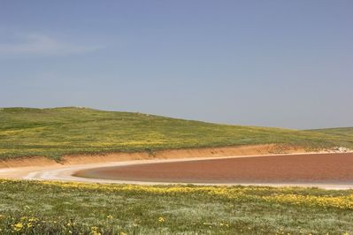 И это только весна. Летом в зависимости от температуры окружающего воздуха, воды озера меняют свой цвет от нежно-розовых до интенсивно-красных и ярко-оранжевых оттенков. Цвет водам придают обитающие в нем микроскопические водоросли, насыщенные пигментом соответствующей цветовой гаммы и рачки артемия, они окрашивают воду и кристаллики соли на дне озера.
