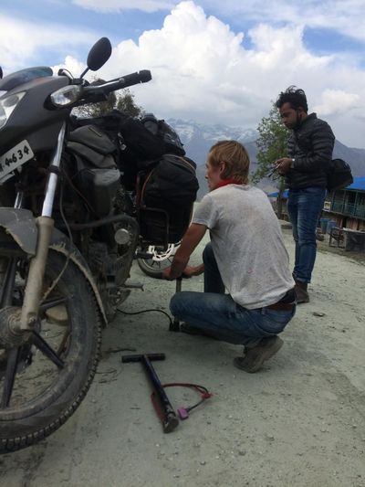 «Проехав» 7 километров, остановились у одного из домов, чтобы попросить насос. На наше счастье, он оказался у одного из постояльцев. На часах было 18:20, через споры, мы решили остаться и переночевать. Долго торгуясь с хозяйкой, заселились в более-менее приятную комнатку. Чай и шоколадки с печеньем были нашей маленькой непальской радостью, вот и сегодня, поклевав острый ужин, мы накинулись на сладости. Через некоторое время колесо опять спустило. Хорошо, что мы не поехали дальше. Спать легли рано, чтобы встать пораньше, съездить в сервис на ремонт и продолжить спуск.