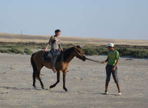 мужчины были не столь фанатичны, ограничившись ногами.В грязевой броне они решили покататься на лошадях, благо к этому времени подтянулись местные джигиты, предлагающие прокатиться за 100 тенге (20 рублей).