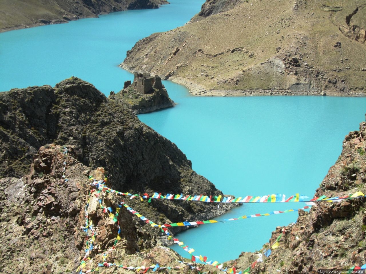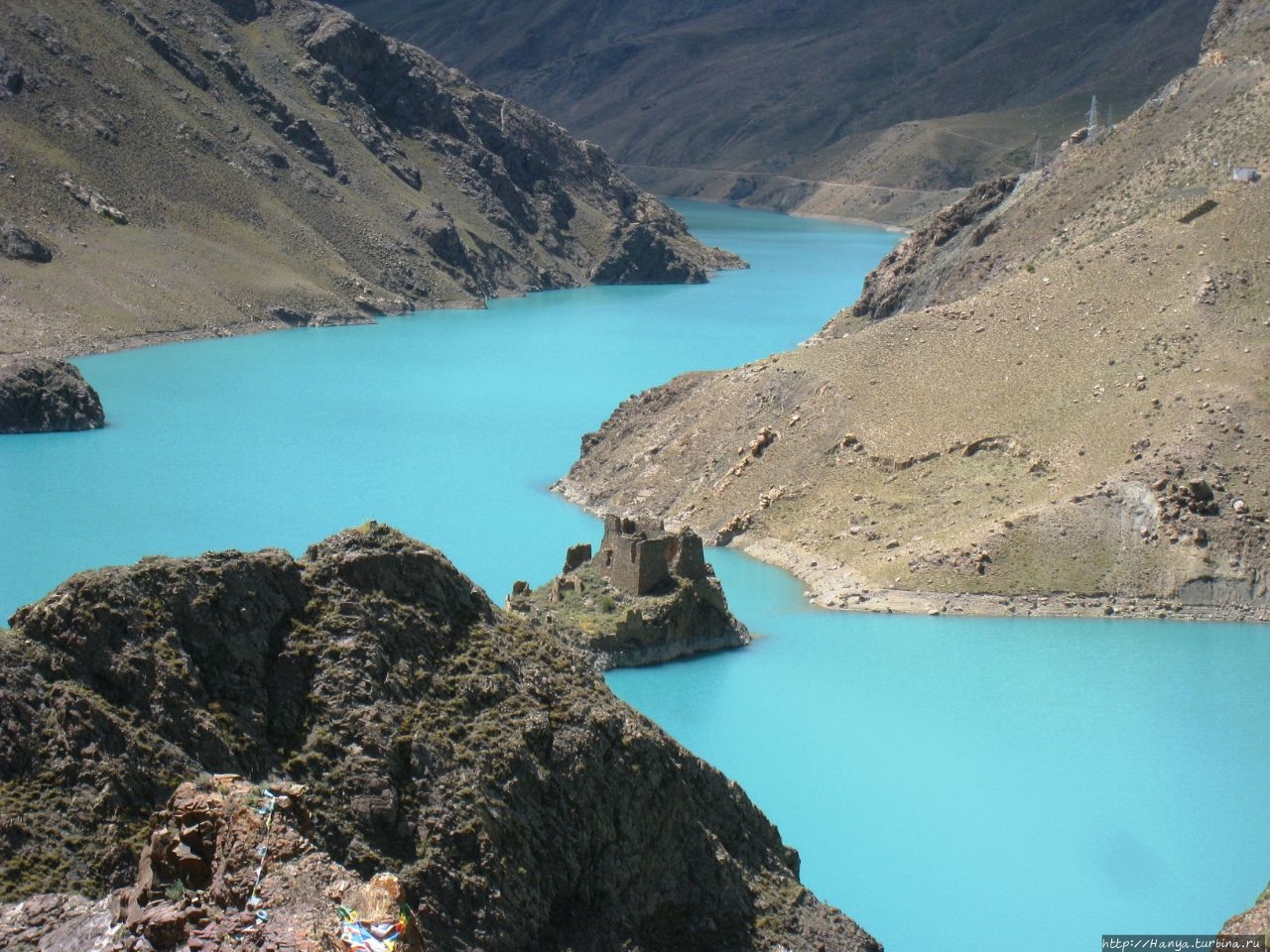 Володя дразнит нас, говоря, что священное озеро Тибета обладает небольшими храмами: Ньингма 16 века нашей эры на острове Yuanbuduo и Samding на юго-западе озера. А вот то, что мы видим внизу – это старый форт или замок под названием Педе Дзонг (Pede Dzong). В узком бутылочном горлышке бирюзовых вод зубцами щетинятся руины того, что в древности защищало эти заповедные места.