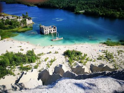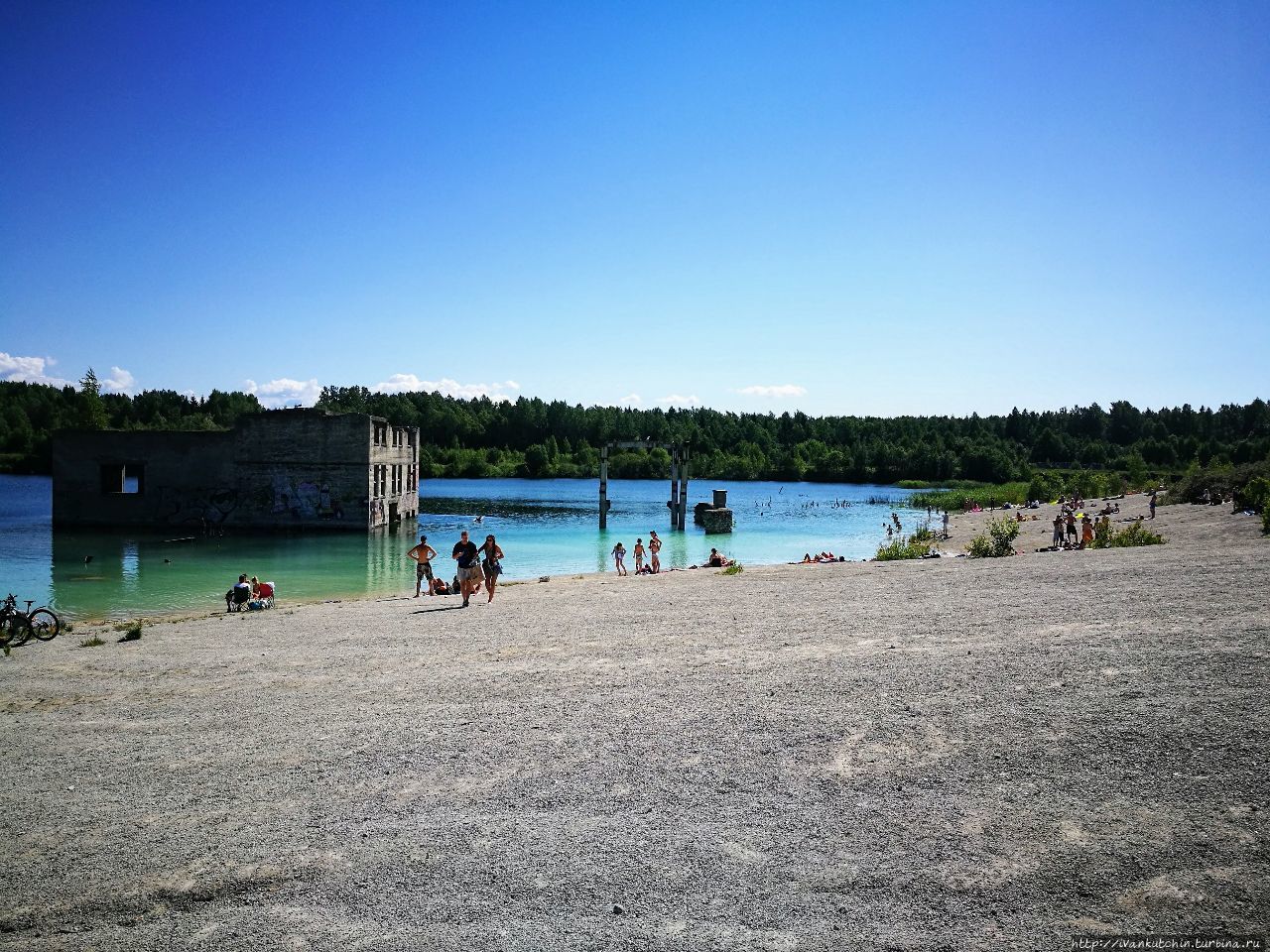 На самом деле это карьер, в котором раньше, добывали щебень. Щебень добывали силами заключенных, тут была тюрьма. Вырыли огромную яму, нагребли огромный отвал, в яму стала стекать вода, тюрьму затопило и ее перенесли в другое место, совсем рядом, но повыше.
