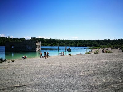 Меня купание в мутной водичке не очень прельщает, поэтому я уделил внимание ползанию по горам. Надо сказать, что склоны отвала довольно крутые. Гора хоть и не очень высока, но залезть за вершину довольно трудно, можно легко соскользнуть вниз. Тем не менее, желающих обозреть окрестности с высоты хоть отбавляй.