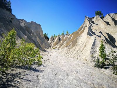 В силу особенностей местного материала, который добывали в карьере, за много лет воздействия дождей и ветров горы приобрели особо острую форму. Выглядят, как бритва, падать на такие гребни очень не хочется.