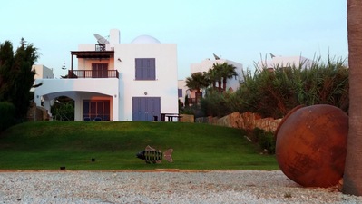 Честно признаюсь, ничего выдающегося здесь нет. Местность холмистая, выжженная, достаточно голая. Всё, что можно, застроено небольшими, однотипными белыми коробками, которые гордо именуются виллами или коробками чуть побольше, которые называются более скромно — апартаменты. Разница в том, что у виллы есть собственный бассейн, а в апартаментах он "коммунальный", то есть рассчитан не только на вас, а на всех проживающих в комплексе из нескольких 2-3 этажных домиков.