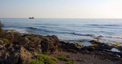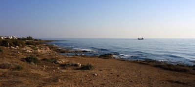 Если пойти от сухогруза вправо по берегу, то можно выйти к небольшой бухточке, в которой паркуются рыбацкие лодки.