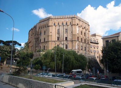 палаццо Норманни — вид с пьяцца ИндепенденцаВ 1072 году, когда Палермо перешёл во власть Роджера II, резиденцию правителей перенесли из бывшего дворца Эмиров в арабскую крепость. Со временем были достроены две башни, из которых до нас дошла только одна.
