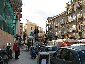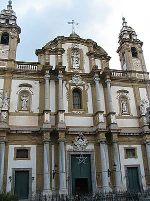 Площадь и церковь Святого Доминика С площади небольшой улочкой Monteleone отправляемся в сторону театра Массимо. В доме 50 на этой улице обратим внимание на ораторию Santa Caterina d'Alessandria. На этом месте по преданию стоял древний дом святой Розалии, покровительницы Палермо и здесь братство Святой Екатерины построило маленькую жемчужину сицилийского рококо в начале 18-го века. Оратория Saint Catherine имеет довольно простой фасад, но внутри имеет богатое украшение. На первом этаже большое количество скульптур и лепных барельефа,, а второй этаж имеет красочные геометрические узоры из мрамора. Над входом две прекрасные статуи олицетворяют науку и мудрость.