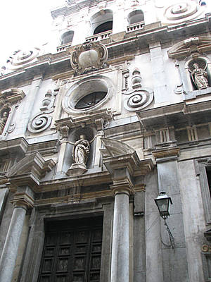 От ворот продолжим прогулку по улице Vittorio Emanuele. Слева будет интересный фонтан Cavallo Marino с лошадкой и младенцами. А далее церковь di San Giovanni dei Napoletani, построенную в 1527 году. В церкви можно увидеть скульптуры справедливости и милосердия, в левом проходе, невинность и грацию в правом. В правом проходе, есть надгробный памятник Дон Томас Trabucco (1690-1761), который был настоятелем братства.