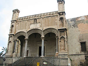 Движение дальше по улице Vittorio Emanuele привело к перекрестку с улицей Alessandro Paternostro куда мы и повернули направо. Наше цель Церковь святого Франциска Ассизского. Для достижения цели повернем налево на piazza San Francesco d’Assisi. Ничем не примечательная с фасада церковь, построенная в 1255 году, становится главным объектом, где 8 декабря происходит религиозный обряд перед изображением Непорочной Девы: глава города преподносит традиционный дар – тридцать серебряных скудо, даёт клятву верности и просит Деву Марию защищать весь город. Фасад, отреставрированный Патриколо, выполнен в позднероманском стиле с готическим порталом, над которым возвышается розетка. В церкви можно увидеть ряд интересных работ художников 16-18 веков. Центральный неф украшают 10 аллегорических статуй, представляющих францисканские добродетели, резца Джакомо Серпотты (1723). Среди них: Кротость с ангелом; Правосудие с обнажённой турецкой саблей, Скромность, отводящая взгляд от зеркала. В храме сохранились деревянные хоры. Интересна коллекция деревянных статуй и картин 16 века в Сокровищнице храма. В церкви также хранится перенесённая со стены на полотно фреска Новелли «Святой Франциск и двое святых» и работы Гаджини.
