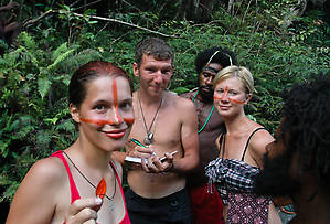 Получается не сразу. Вало просто волнуется под нашими взглядами. Когда котека оказывается на своем месте, он привязывает ее веревочкой к талии и избавляется от шорт. Теперь перед нами голожопый абориген с луком и стрелами. Уверенным шагом он идет к церкви, вокруг которой растут аккуратные кустики. С них Вало срывает листья, которые он засовывает под браслеты на бицепсах. Затем он находит костровище, где совсем недавно на раскаленных камнях готовили свинью. Он садится на корточки и пальцами трет угольки. Кончики его пальцев чернеют. Ими папуас рисует полоски на своем лице, высунув язык при этом.