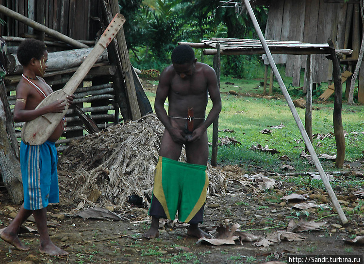 Почему ушли Утро. В деревне Мбомбанг звучит музыка с незатейливым мотивом и местные музыканты, которые еле уместились на сухом бревне, пока только разогреваются. Их четверо и есть среди них ребенок, который играет на флейте. По правую руку от него сидит Тетиус – невысокий папуас с обнаженным торсом, густой бородой и косичками. Он бренчит на шестиструнной самопальной гитаре и звуки, которые она издает, напоминают мне гавайскую гитару. Рядом с ним второй гитарист. Он упирается своим инструментом в бревно и пытается поспеть за Тетиусом. Завершает четверку молодой парень Вало. У него нет ни гитары, ни флейты. Поэтому в руках он держит лук и стрелы. Вало стучит по ним, попадая в ритм. Тут Тетиус запевает песню на местном языке, которая отлично ложится на музыку с незатейливым мотивом, и слова ее подхватывают остальные участники выступления.
