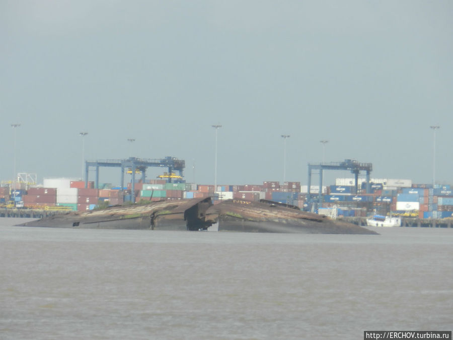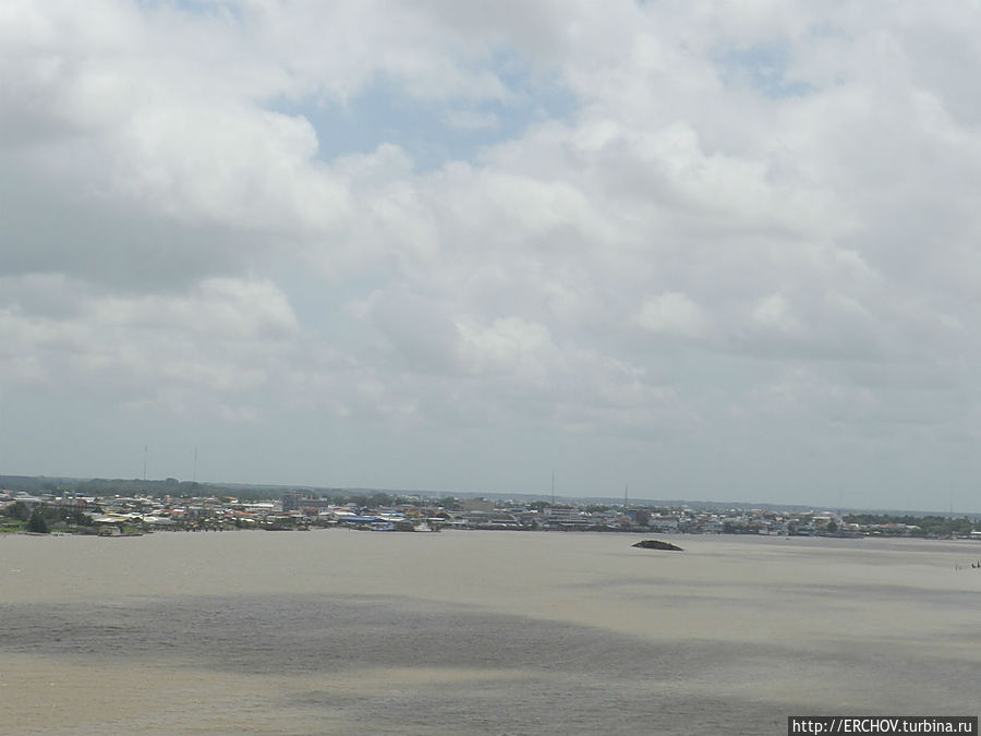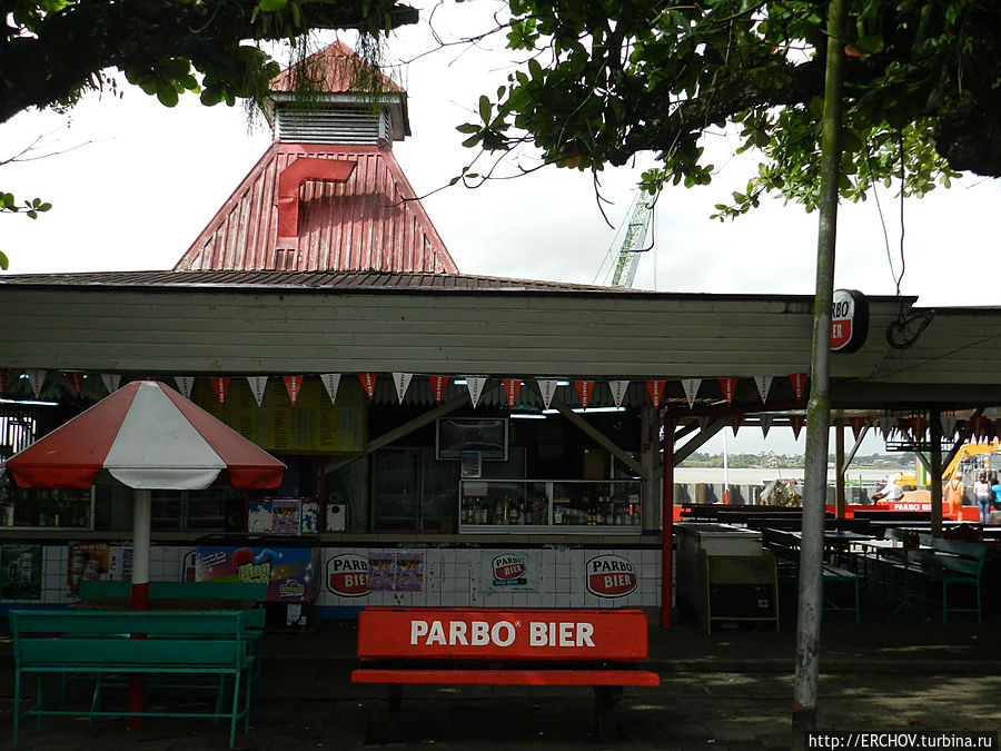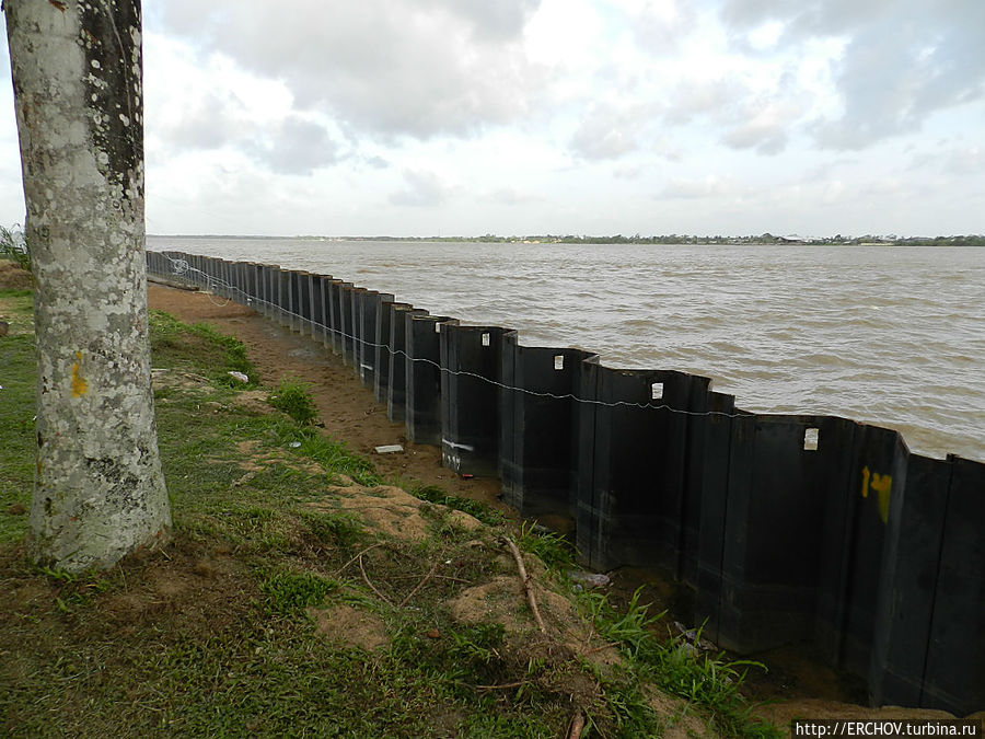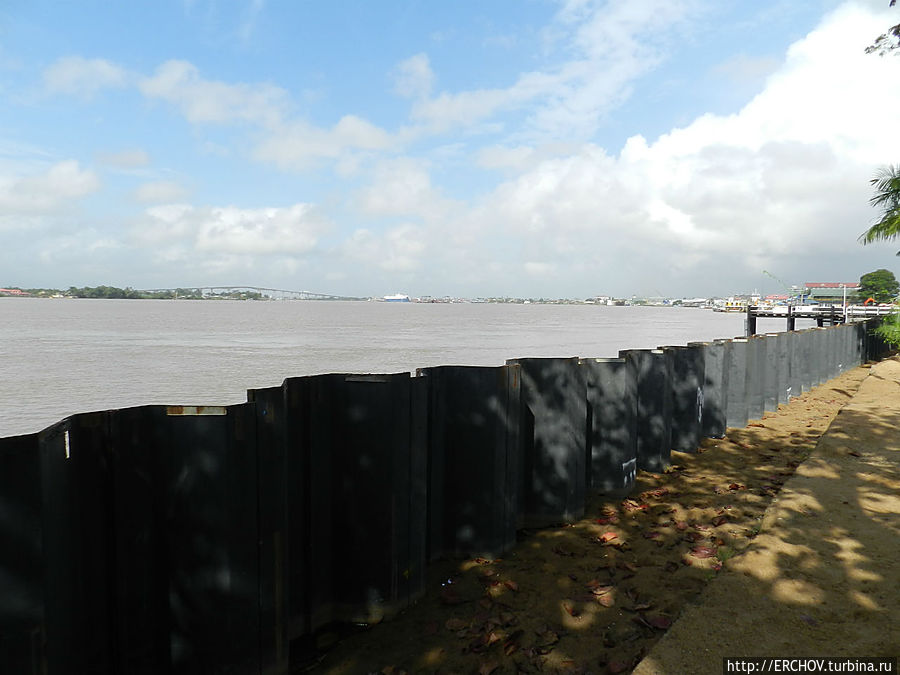 Река Суринам огорожена от города (скорее город от неё) толстыми железными листами. Городской порт загруженным назвать нельзя. Недалеко от порта торчит из реки расколовшийся на две части ржавый корпус затопленного корабля. С ним связана интересная история.