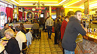 Зал кафе, полный туристов, украшает афиша фильма.