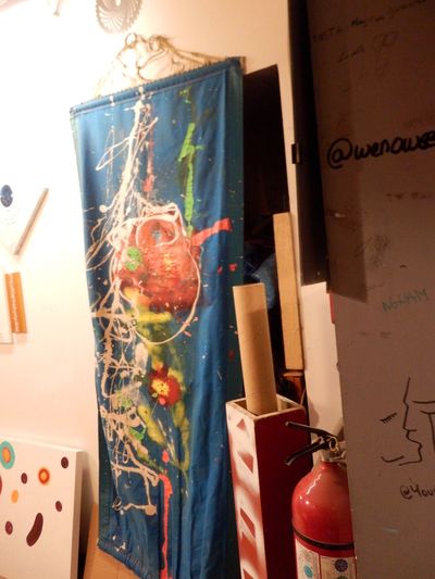 на всем пространстве сквота размещаются десятки картин, весь подъезд — сплошная галерея современного искусства.