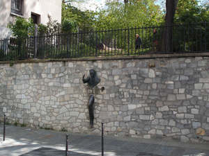 Неподалеку от мельницы мы набрели на маленькую площадь, названную в честь французского писателя Марселя Эме (Place Marcel-Ayme). Памятник писателю сделал его друг, знаменитый актер Жан Маре, который кроме артистического дара, обладал талантами поэта и скульптора.