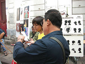 Эта история произошла со мной летом 2012 г. в квартале художников в районе Монмартра. В июле там , образно говоря, яблоку негде было упасть, а местные художники с большими планшетами в руках всеми силами пытаются остановить прохожих для того, чтобы нарисовать их портрет.