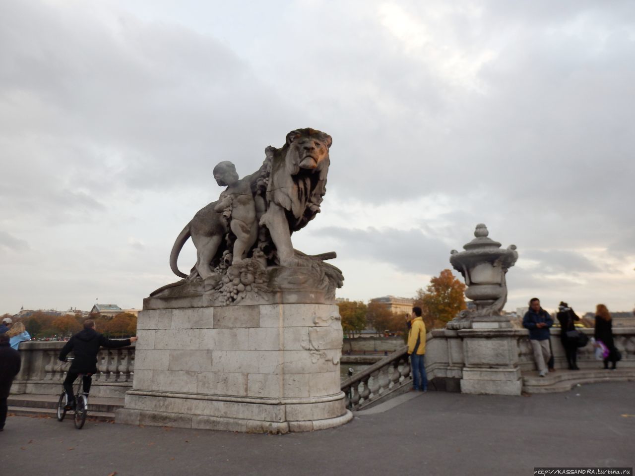 Скульптуры на мосту символизируют Науку и Искусство, Торговлю и Промышленность. Мост украшают нимфы морских чудища, многие скульптуры покрыты золотом, как любят у нас в России.