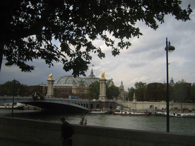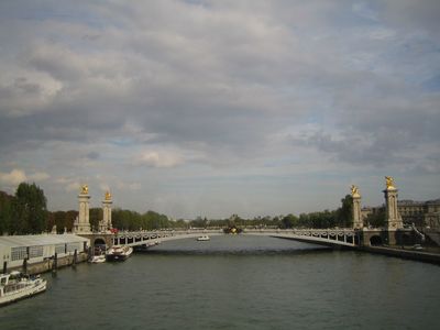 Украшенный скульптурными композициями внизу и золочеными — наверху, он, действительно, чем-то неуловимо напоминает архитектуру Санкт Петербурга. Удивительно красивы фонари на мосту, изготовленные из горного карельского хрусталя. В центральной арке моста с двух сторон находятся герб Санкт Петербурга с изображением нимфы, олицетворяющей реку Неву, и герб Парижа с нимфами реки Сены. Сена производит на меня странное впечатление; мне кажется, что она меньше Невы, и вода в ней другого цвета...