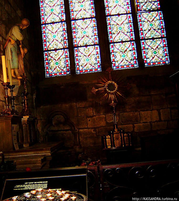 Витраж в виде цветка розы над входом в собор Парижской Богоматери старинный, но хорошо сохранился и был отреставрирован. В центре розы находится Богоматерь, а на «лепестках» изображены знаки зодиака, символы добродетелей и пороков. Диаметр главного витража — около десяти метров. Он состоит из восьмидесяти известных сценок из Ветхозаветной истории. Два боковых витража тоже выполнены в виде роз диаметром тринадцать метров. Это самые большие витражи в Европе. Расцвет витражного искусства Франции произошел в тринадцатом веке в Шартре. Первые фигурные стекла с орнаментом были не окрашены. Эти подобия средневековых витражей Нотр Дама были обнаружены в церквях монастырей Англии в седьмом веке.