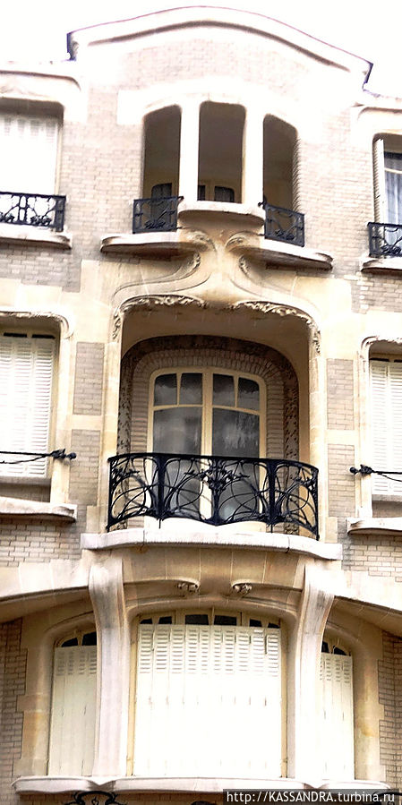 Все элементы здания, окна и балконы подчеркнуты плавными и одновременно четкими линиями украшений, выполненных из черного металла с растительным рисунком. Окно-витрину первого этажа обрамляют украшения в виде текучих, словно льющихся сверху форм.