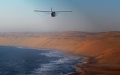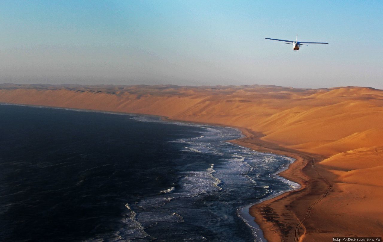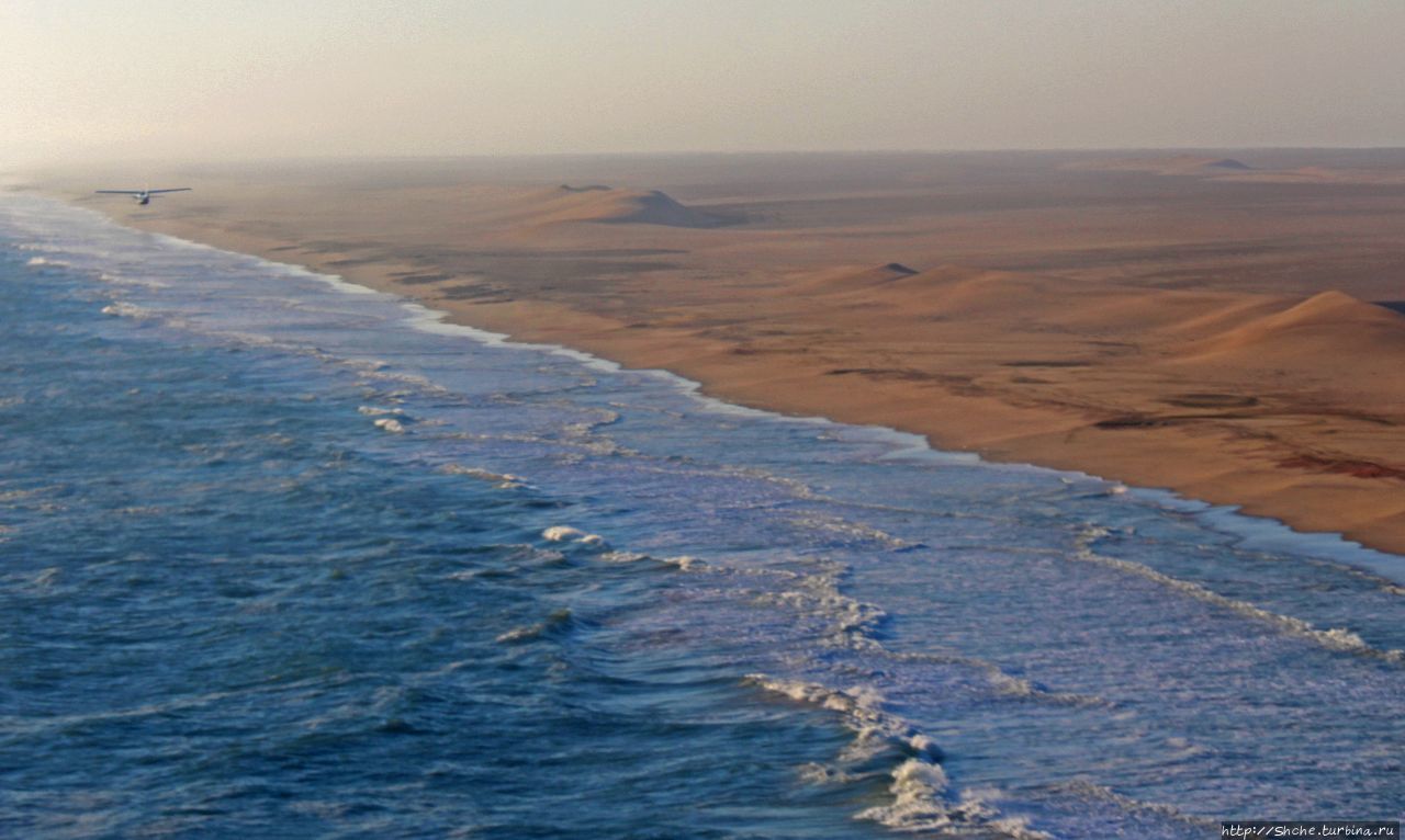 Под крылом самолета о чем-то поет песчаное море Намиб, уже практически на закате мы приблизились к берегу океана... Напомню, 12 человек из нашей команды решились на сценический полет над пустыней, для чего было арендавано три небольших самолета...