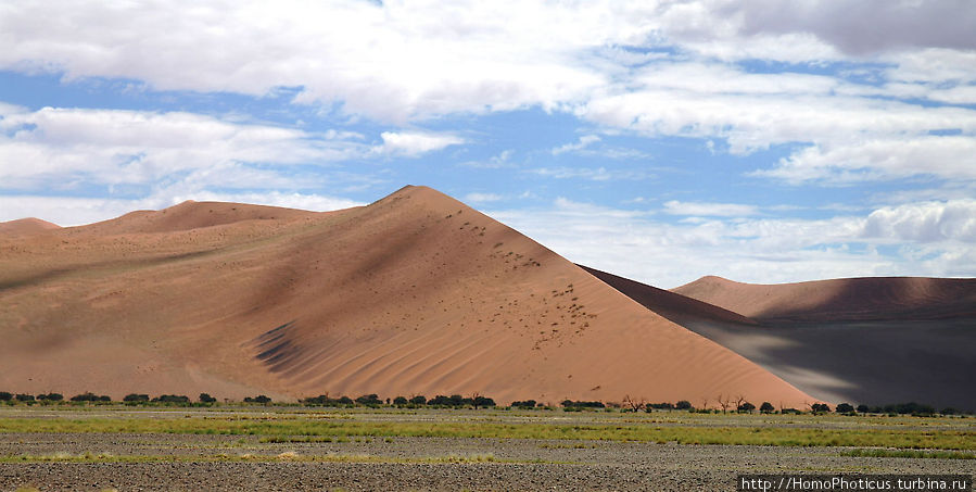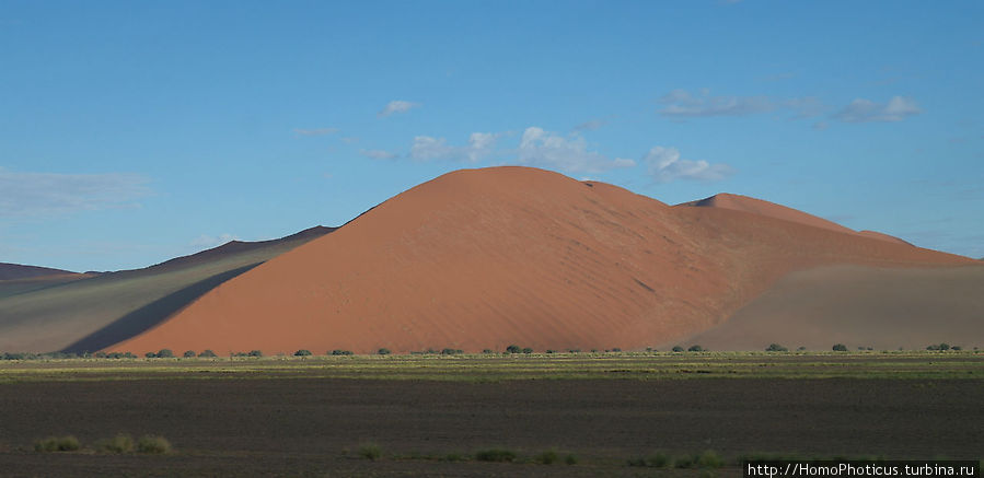 Дюны очень древние, оранжево-красный их цвет обусловлен большой насыщенностью железом, а кое-где выглядывающие черные прослойки говорят о наличии даже магнитного железняка. Самая большая дюна — Большой Папа — порядка 380 метров! Не так уж и много небоскребов в мире, которые могут помериться с этой горой песка! Рядом находится и Большая Мама, но она чуть скромнее:) В целом, дюны могут перемещаться, но обычно эти движения обусловлены только изменением розы ветров, в целом можно считать, что они довольно стабильны.