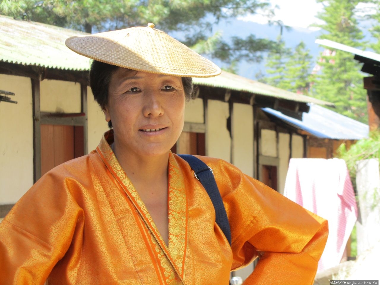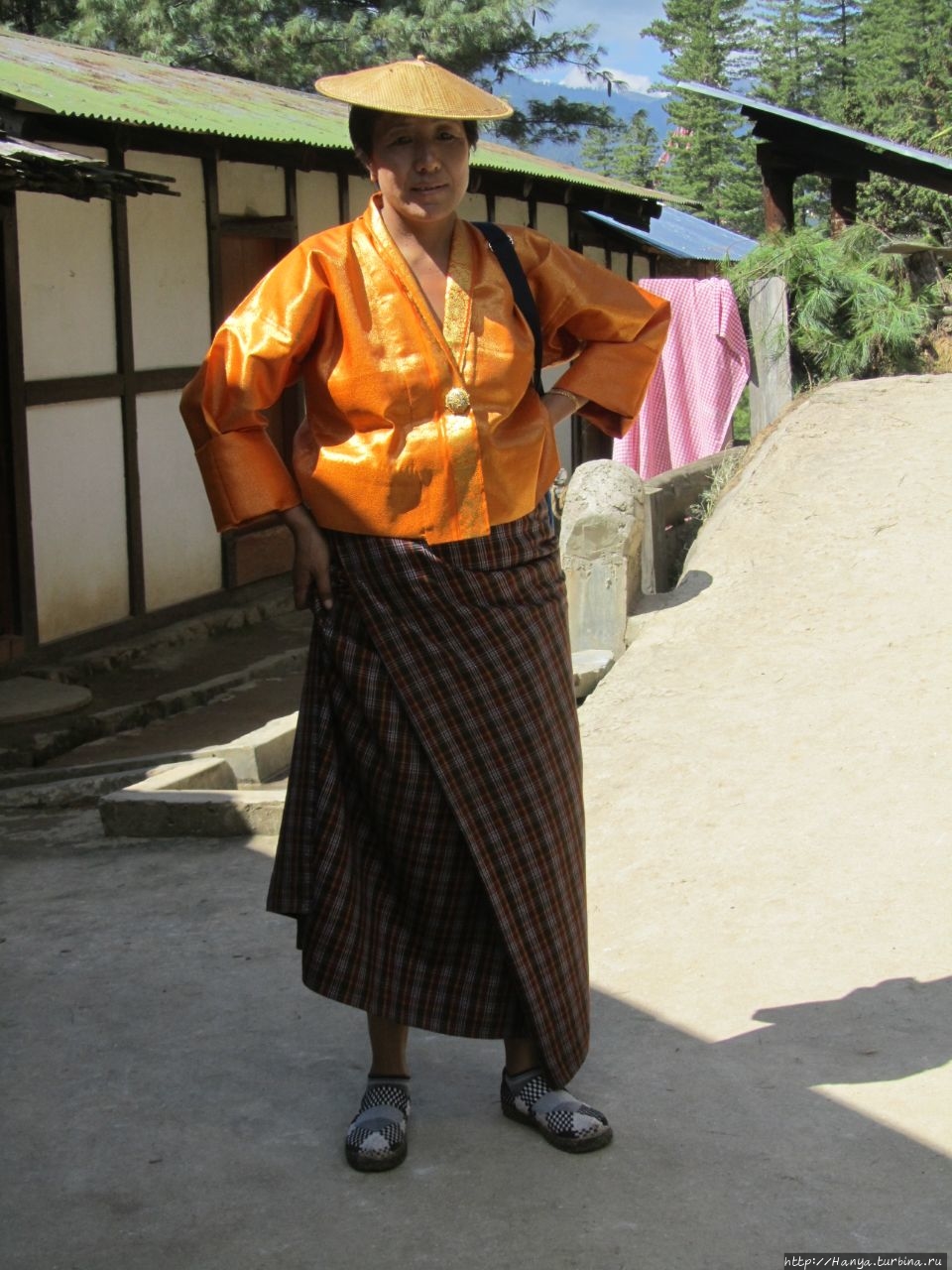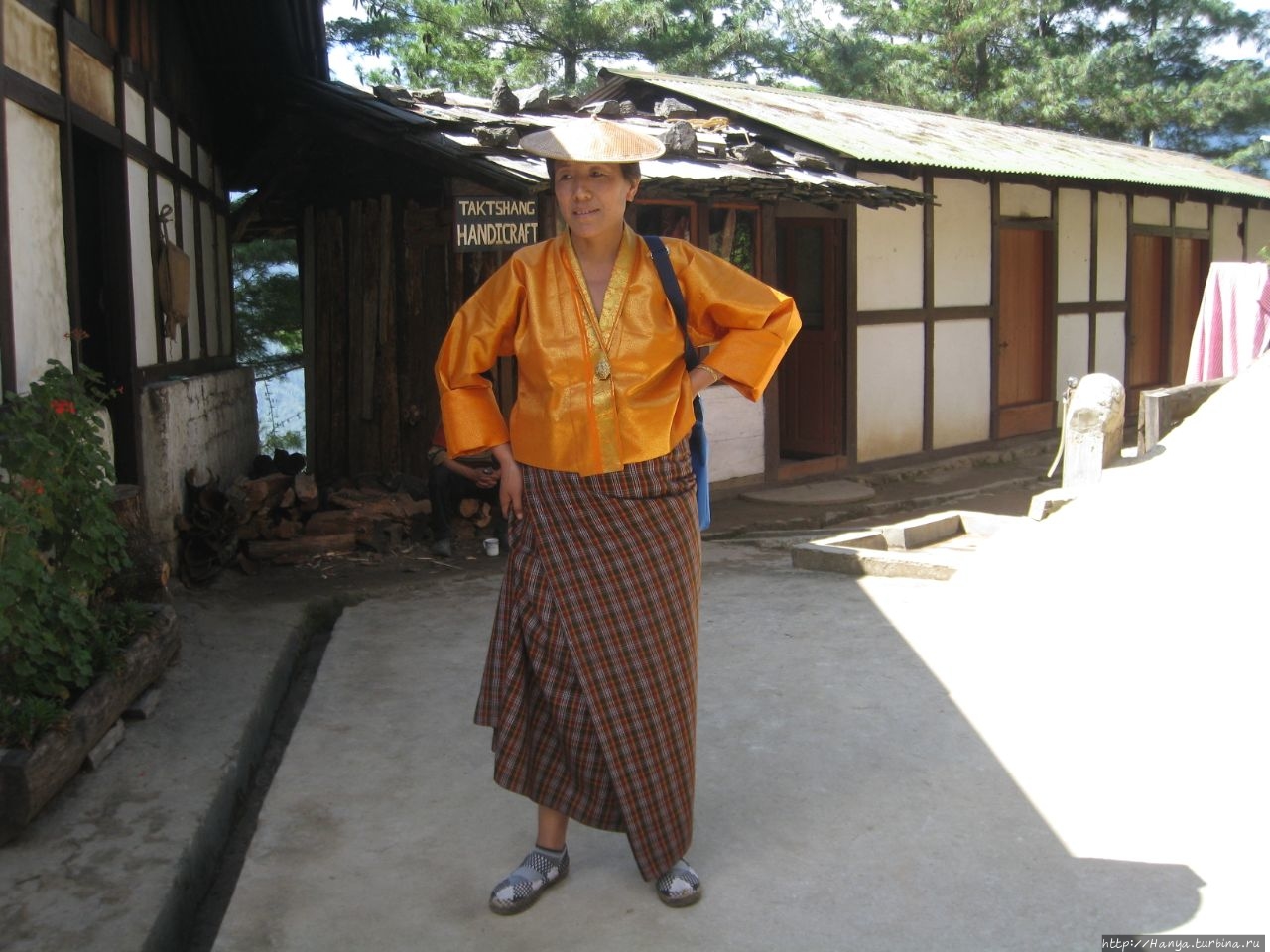 В кафетерии Taktshang Cafeteria на входе нас встречает бутанка в традиционной одежде кира – юбке в пол, особым образом обернутой вокруг талии с запахом и коротком желтом жакете тего. Венчает всю эту красоту какая-то необычная шляпка, напоминающая тарелку от ударного инструмента.